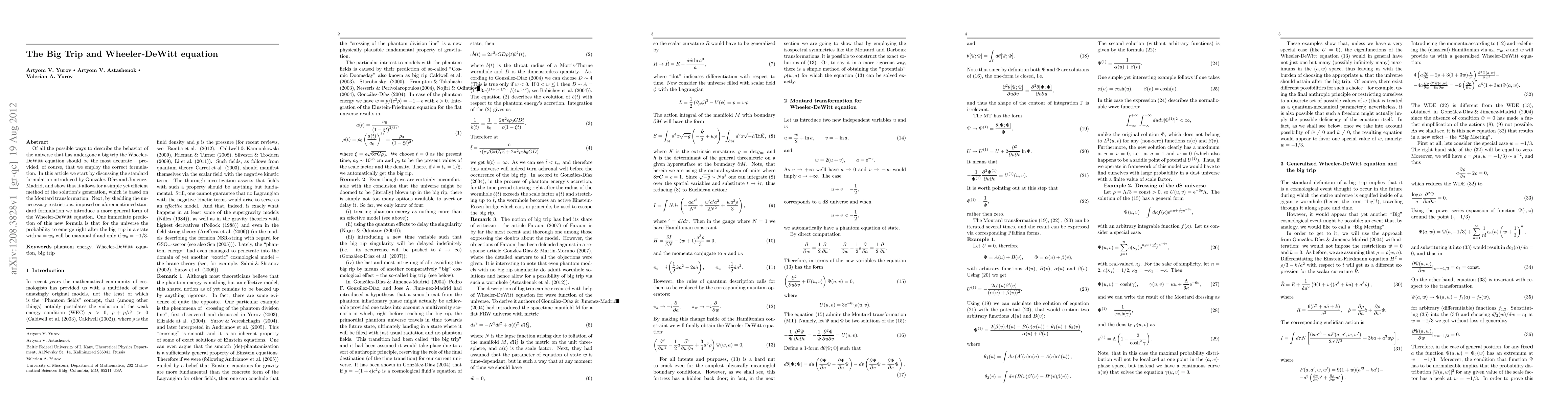 Of all the possible ways to describe the behavior of the universe that has undergone a big trip the Wheeler-DeWitt equation should be the most accurate -- provided, of course, that we employ the correct formulation. In this article we start by discussing the standard formulation introduced by Gonz\'alez-D\'iaz and Jimenez-Madrid, and show that it allows for a simple yet efficient method of the solution's generation, which is based on the Moutard transformation. Next, by shedding the unnecessary restrictions, imposed on aforementioned standard formulation we introduce a more general form of the Wheeler-DeWitt equation. One immediate prediction of this new formula is that for the universe the probability to emerge right after the big trip in a state with $w=w_0$ will be maximal if and only if $w_0=-1/3$.