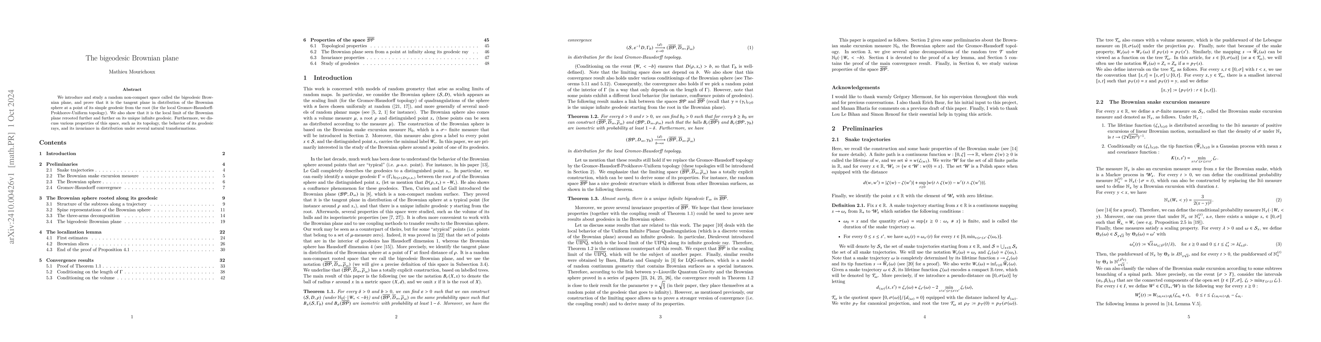 The bigeodesic Brownian plane is a random non-compact space proven to be the tangent plane in distribution of the Brownian sphere at a point along its simple geodesic. It also emerges as the local limit of the Brownian plane rerooted along its infinite geodesic.
