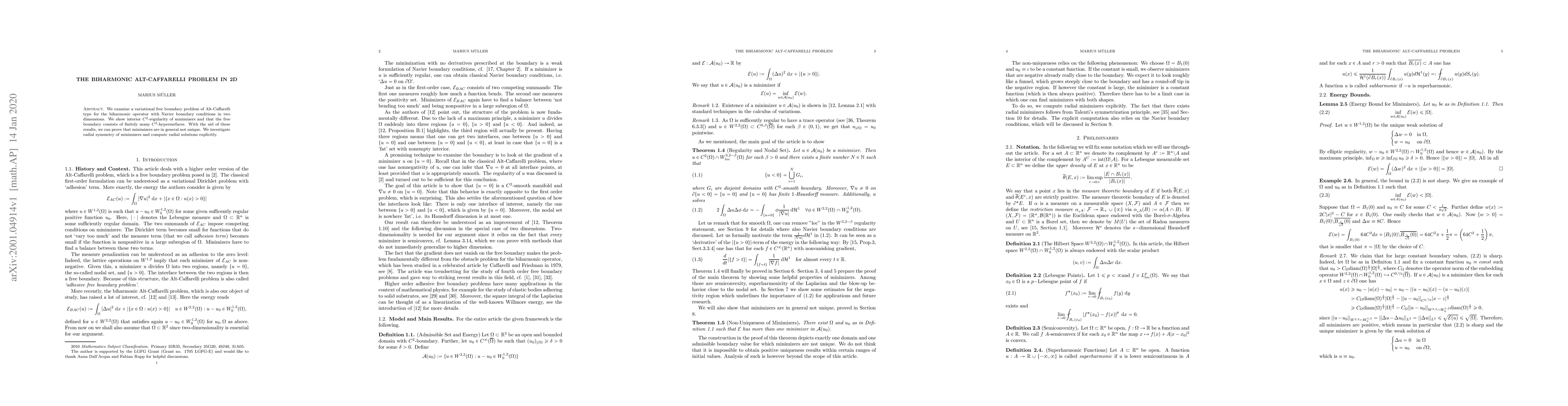 The paper investigates the Biharmonic Alt-Caffarelli problem in 2D, showing interior C2-regularity of minimizers and non-uniqueness, with implications for understanding the behavior of solutions under Navier boundary conditions.