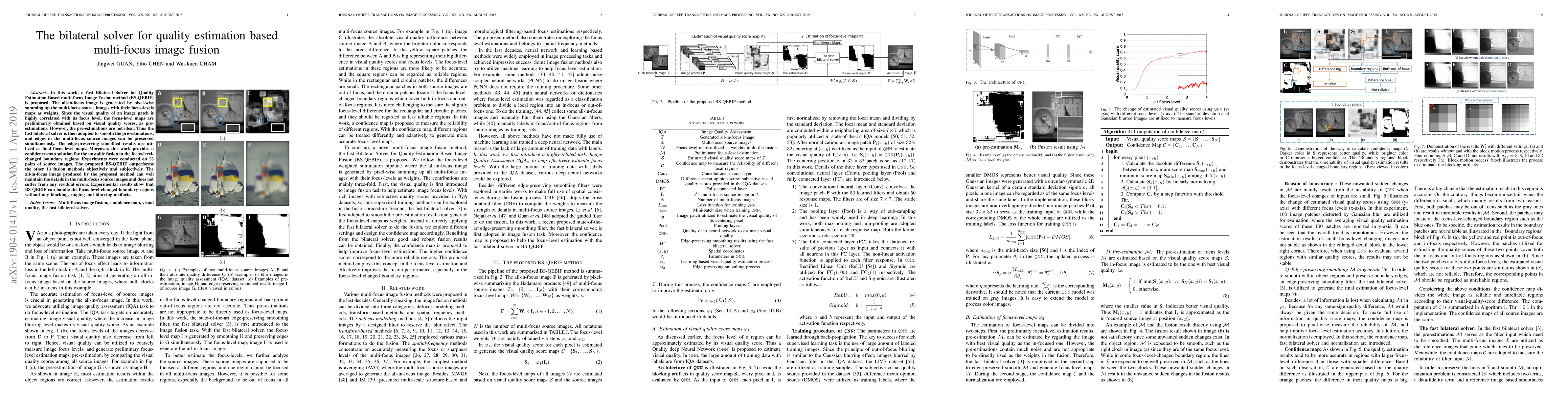 The paper proposes a fast Bilateral Solver for Quality Estimation Based multi-focus Image Fusion (BS-QEBIF) method that generates an all-in-focus image by summing up multi-focus source images weighted by their focus-level maps. The method improves initial focus-level estimates using a bilateral solver to preserve edges and provides a confidence-map solution for boundary regions, outperforming other fusion methods in both objective and subjective evaluations.