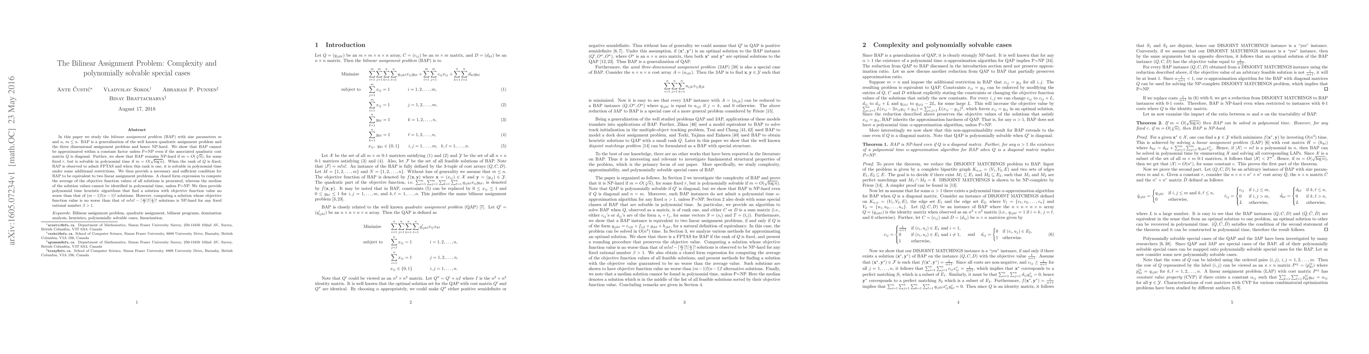 This paper investigates the complexity of the bilinear assignment problem (BAP), demonstrating its NP-hardness and inapproximability. It identifies polynomially solvable cases when the size parameter $m$ is $O(\sqrt{\log n})$ and provides FPTAS for fixed rank matrices. It also discusses heuristic algorithms for finding near-optimal solutions.