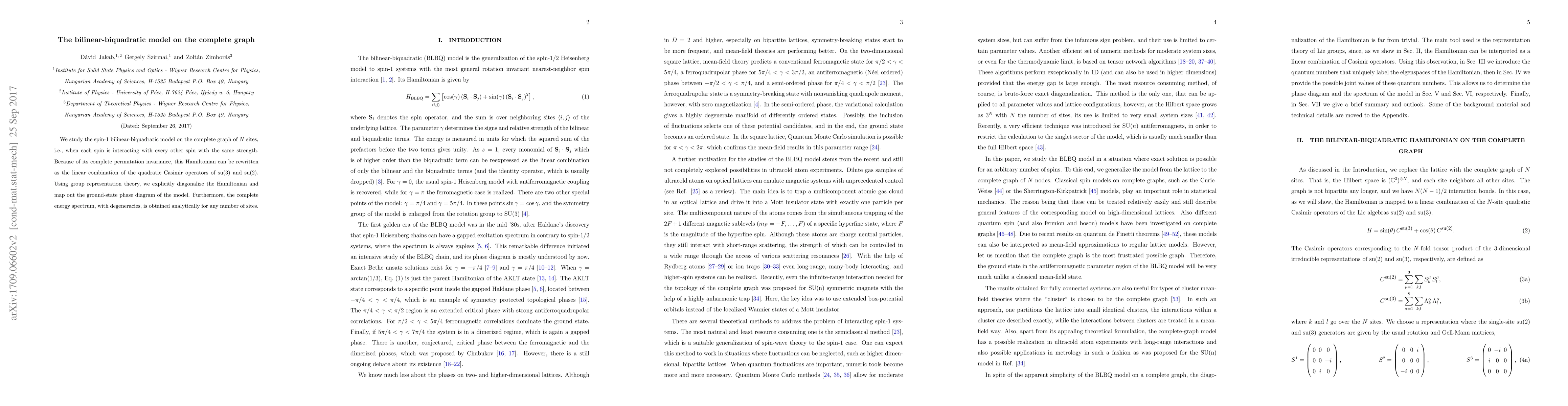 We study the spin-1 bilinear-biquadratic model on the complete graph of N sites, i.e., when each spin is interacting with every other spin with the same strength. Because of its complete permutation invariance, this Hamiltonian can be rewritten as the linear combination of the quadratic Casimir operators of su(3) and su(2). Using group representation theory, we explicitly diagonalize the Hamiltonian and map out the ground-state phase diagram of the model. Furthermore, the complete energy spectrum, with degeneracies, is obtained analytically for any number of sites.