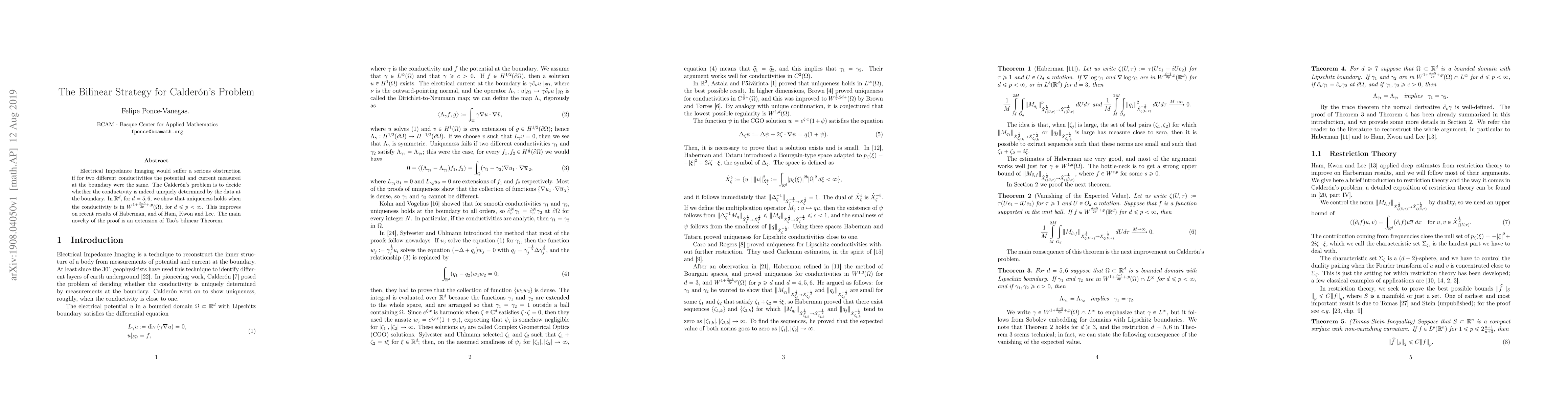 This paper addresses Calder\'on's problem in higher dimensions, proving uniqueness for determining conductivity from boundary data when the conductivity is in a specific Sobolev space. The proof leverages an extension of Tao's bilinear theorem, improving upon recent results.