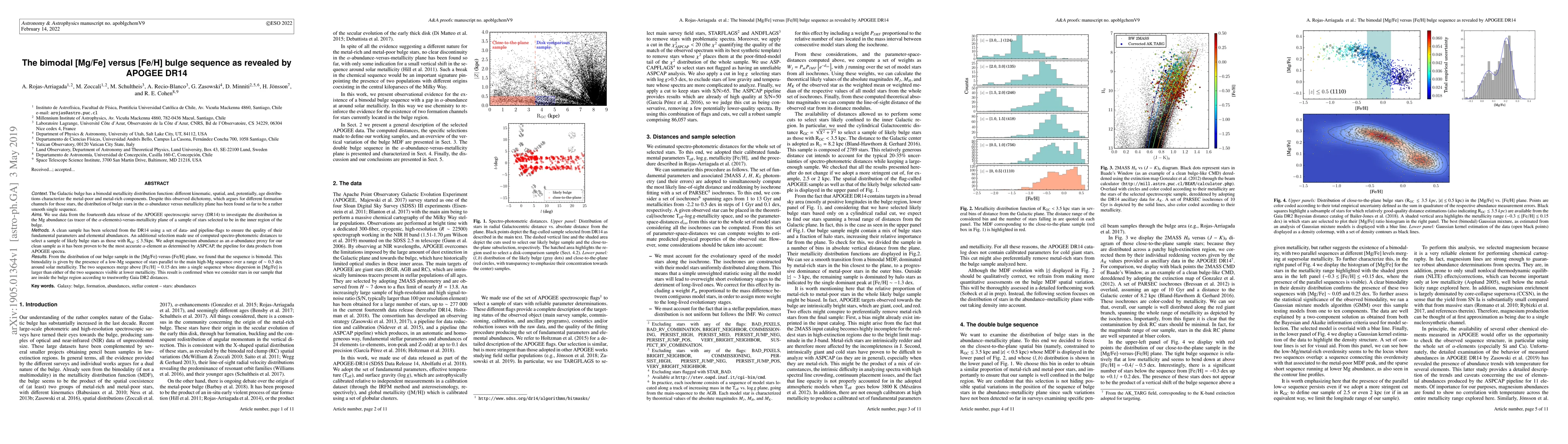 The APOGEE DR14 data reveal a bimodal [Mg/Fe] versus [Fe/H] sequence in the Galactic bulge, indicating two distinct populations with different $\alpha$-element abundances and potentially different formation channels. The sequences merge at higher metallicities, suggesting a complex star formation history.