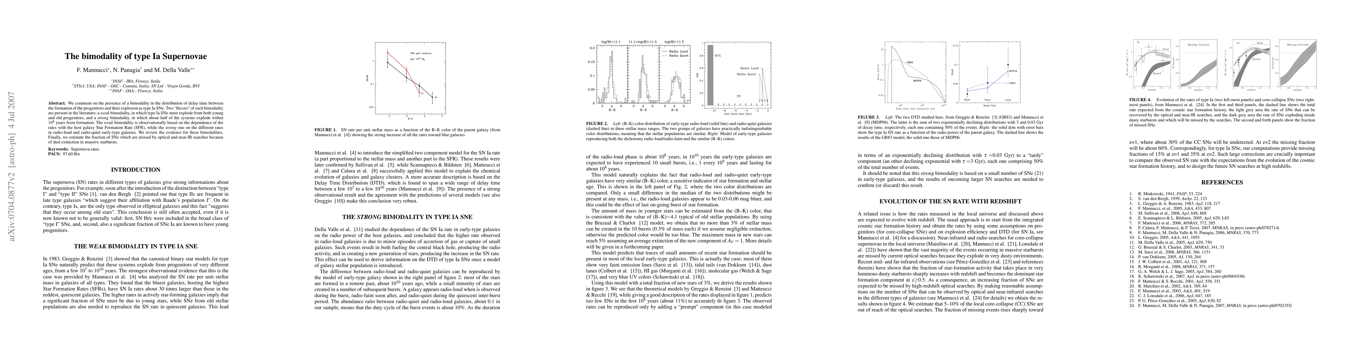 This paper discusses the bimodality in the delay time distribution of type Ia supernovae (SNe), identifying two types: a "weak" bimodality based on host galaxy star formation rates and a "strong" bimodality observed in radio-loud versus radio-quiet galaxies. The study reviews evidence for these bimodalities and estimates the fraction of SNe missed by optical and near-IR searches due to dust extinction.