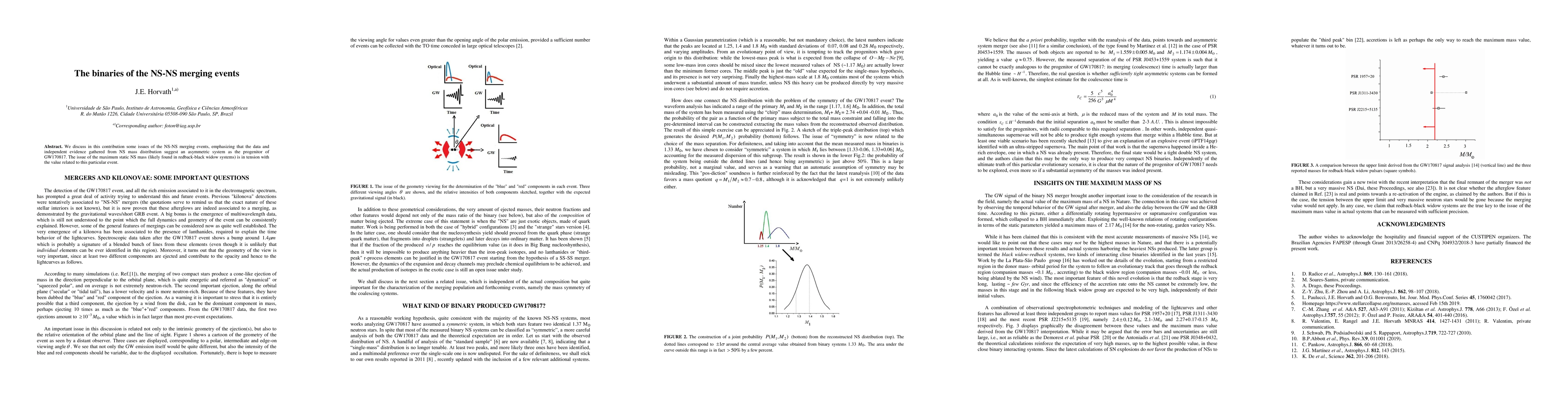 We discuss in this contribution some issues of the NS-NS merging events, emphasizing that the data and independent evidence gathered from NS mass distribution suggest an asymmetric system as the progenitor of GW170817. The issue of the maximum static NS mass (likely found in redback-black widow systems) is in tension with the value related to this particular event.