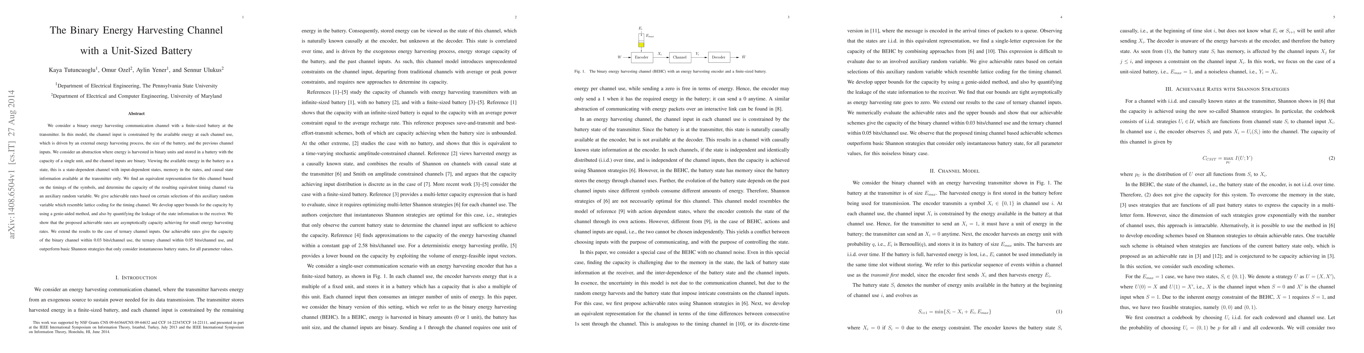 We consider a binary energy harvesting communication channel with a finite-sized battery at the transmitter. In this model, the channel input is constrained by the available energy at each channel use, which is driven by an external energy harvesting process, the size of the battery, and the previous channel inputs. We consider an abstraction where energy is harvested in binary units and stored in a battery with the capacity of a single unit, and the channel inputs are binary. Viewing the available energy in the battery as a state, this is a state-dependent channel with input-dependent states, memory in the states, and causal state information available at the transmitter only. We find an equivalent representation for this channel based on the timings of the symbols, and determine the capacity of the resulting equivalent timing channel via an auxiliary random variable. We give achievable rates based on certain selections of this auxiliary random variable which resemble lattice coding for the timing channel. We develop upper bounds for the capacity by using a genie-aided method, and also by quantifying the leakage of the state information to the receiver. We show that the proposed achievable rates are asymptotically capacity achieving for small energy harvesting rates. We extend the results to the case of ternary channel inputs. Our achievable rates give the capacity of the binary channel within 0.03 bits/channel use, the ternary channel within 0.05 bits/channel use, and outperform basic Shannon strategies that only consider instantaneous battery states, for all parameter values.