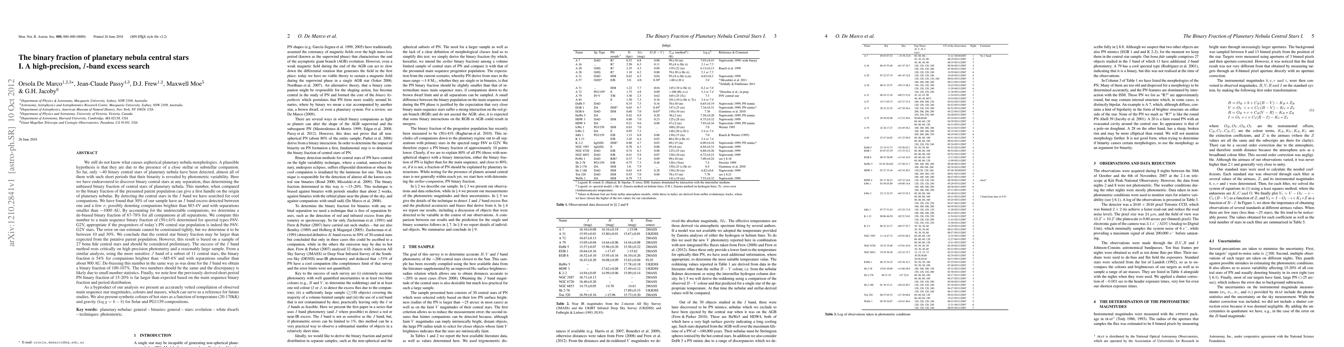 In an attempt to determine how many planetary nebulae derive from binary interactions, we have started a project to measure their unbiased binary fraction. This number, when compared to the binary fraction of the presumed parent population can give a first handle on the origin of planetary nebulae. By detecting 27 bona fide central stars in the I band we have found that 30% of our sample have an I band excess between one and a few sigmas, possibly denoting companions brighter than M3-4V and with separations smaller than approximately 1000 AU. By accounting for the undetectable companions, we determine a de-biased binary fraction of 67-78% for all companions at all separations. We compare this number to a main sequence binary fraction of (50+/-4)% determined for spectral types F6V-G2V, appropriate if the progenitors of today's PN central star population is indeed the F6V-G2V stars. The error on our estimate could be between 10 and 30%. We conclude that the central star binary fraction may be larger than expected from the putative parent population. Using the more sensitive J band of a subset of 11 central stars, the binary fraction is 54% for companions brighter than approximately M5-6V and with separations smaller than about 900 AU. De-biassing this number we obtain a binary fraction of 100-107%. The two numbers should be the same and the discrepancy is likely due to small number statistics. We also present an accurately vetted compilation of observed main sequence star magnitudes, colours and masses, which can serve as a reference for future studies. We also present synthetic colours of hot stars as a function of temperature (20-170kK) and gravity (log g= 6-8) for Solar and PG1159 compositions.