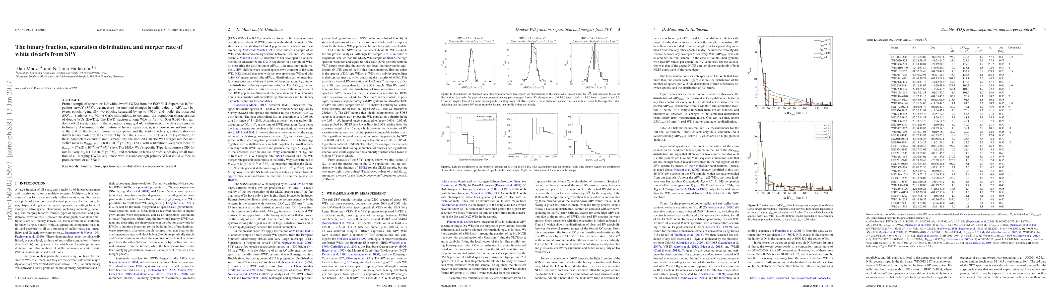 From a sample of spectra of 439 white dwarfs (WDs) from the ESO-VLT Supernova-Ia Progenitor surveY (SPY), we measure the maximal changes in radial-velocity (DRVmax) between epochs (generally two epochs, separated by up to 470d), and model the observed DRVmax statistics via Monte-Carlo simulations, to constrain the population characteristics of double WDs (DWDs). The DWD fraction among WDs is fbin=0.100+/-0.020 (1-sigma, random) +0.02 (systematic), in the separation range ~<4AU within which the data are sensitive to binarity. Assuming the distribution of binary separation, a, is a power-law, dN/da ~ a^alpha, at the end of the last common-envelope phase and the start of solely gravitational-wave-driven binary evolution, the constraint by the data is alpha=-1.3+/-0.2 (1-sigma) +/-0.2 (systematic). If these parameters extend to small separations, the implied Galactic WD merger rate per unit stellar mass is R_merge=(1-80)e-13 /yr/Msun (2-sigma), with a likelihood-weighted mean of R_merge=(7+/-2)e-13 /yr/Msun (1-sigma). The Milky Way's specific Type-Ia supernova (SN Ia) rate is likely R_Ia~1.1e-13 /yr/Msun and therefore, in terms of rates, a possibly small fraction of all merging DWDs (e.g. those with massive-enough primary WDs) could suffice to produce most or all SNe Ia.