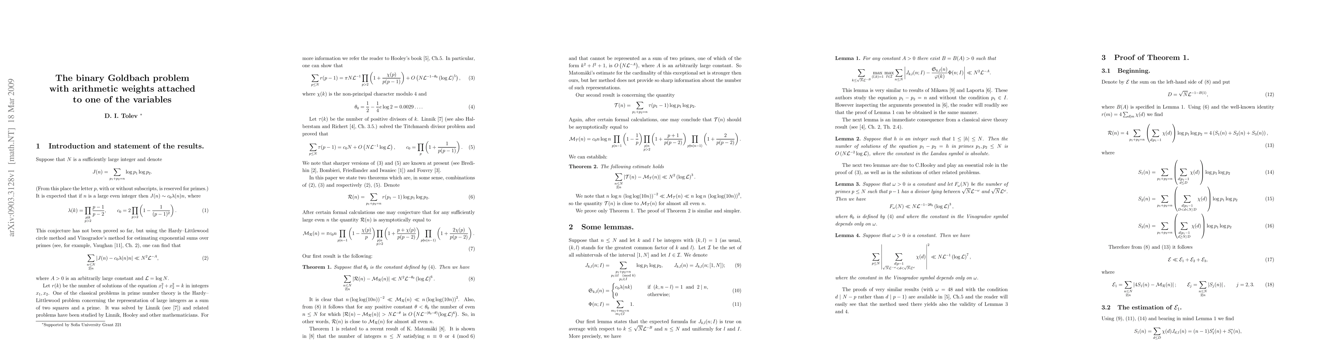 Summary: This research investigates the binary Goldbach conjecture under the condition that one variable carries an arithmetic weight, exploring how these weights affect the distribution and properties of solutions.