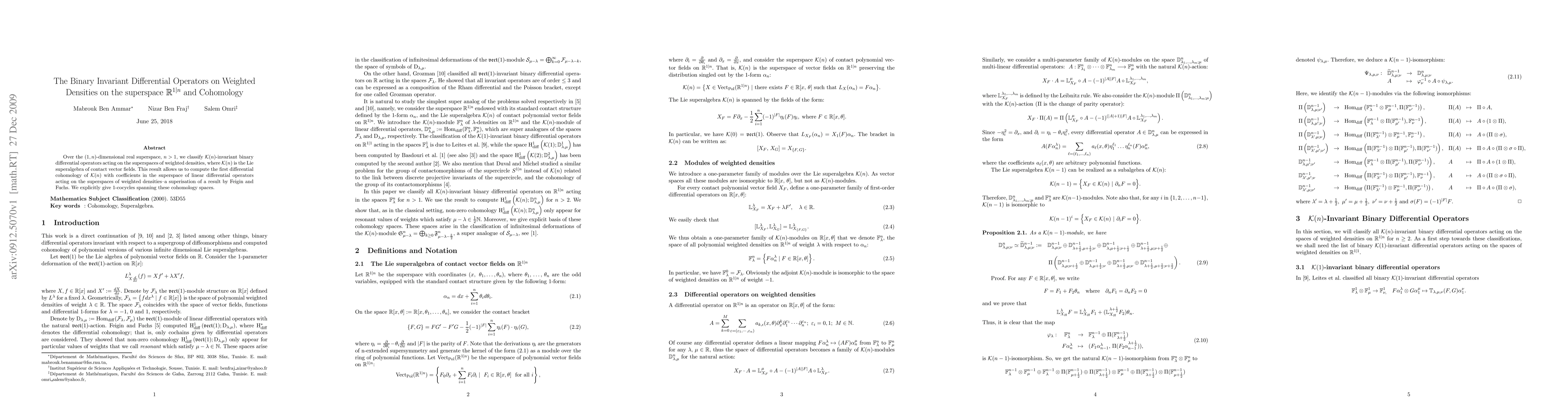 This paper classifies $\mathcal{K}(n)$-invariant binary differential operators on weighted densities over the $(1,n)$-dimensional real superspace, enabling the computation of the first differential cohomology of $\mathcal{K}(n)$ with coefficients in the superspace of linear differential operators, extending a result by Feigin and Fuchs. Explicit 1-cocycles are provided for these cohomology spaces.