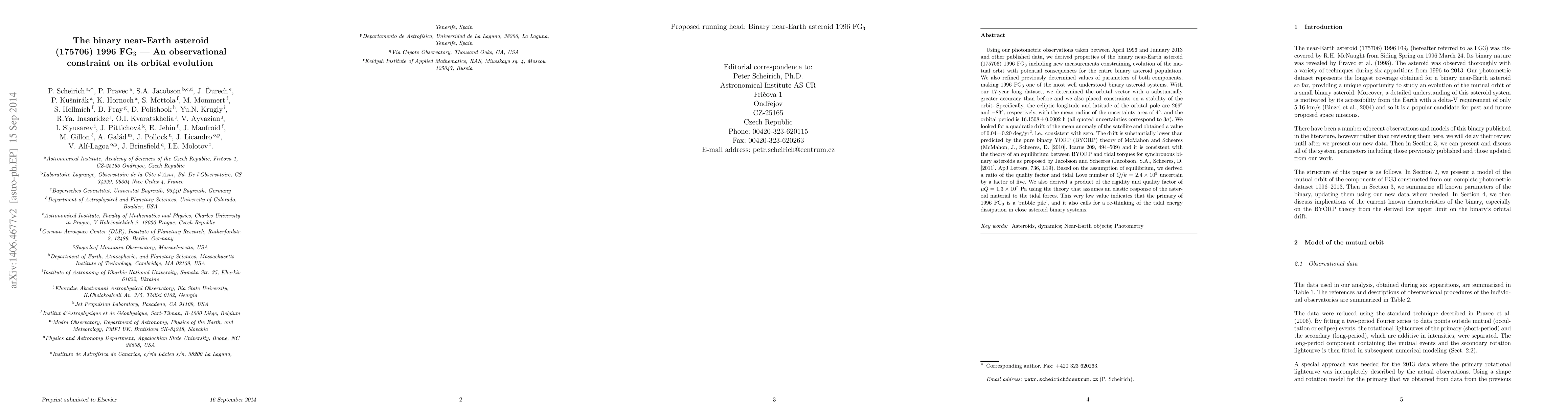 This paper provides refined properties of the binary near-Earth asteroid (175706) 1996 FG3, including a more accurate orbital vector and stability constraints. The study suggests that the asteroid's orbit is consistent with an equilibrium between binary YORP and tidal torques, indicating a 'rubble pile' structure for the primary component and challenging current models of tidal energy dissipation in close asteroid binaries.