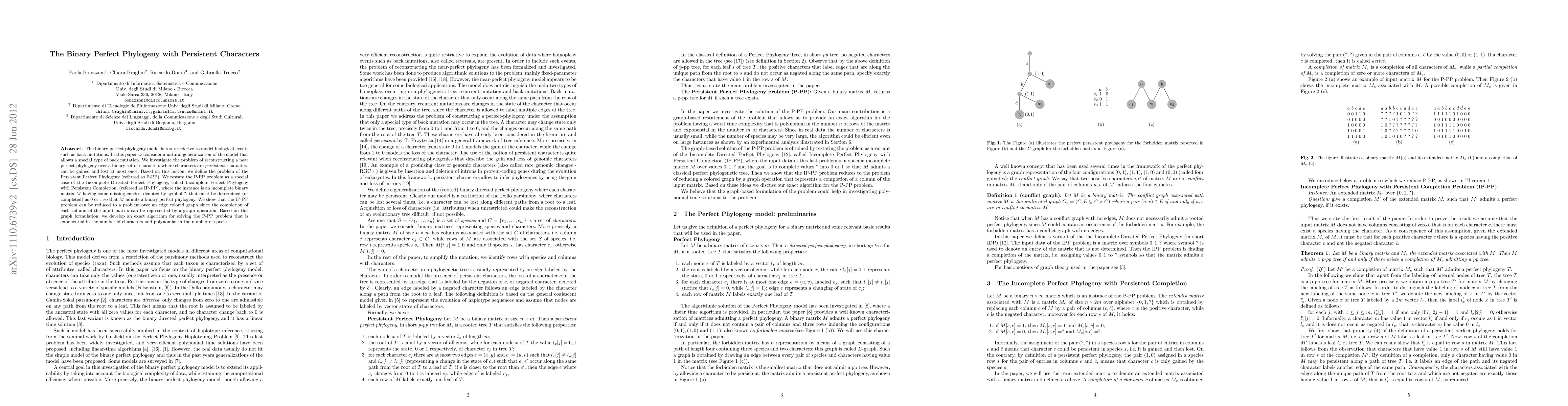 This paper generalizes the binary perfect phylogeny model to allow back mutations, defining the Persistent Perfect Phylogeny (P-PP) problem where characters can be gained and lost at most once. It reformulates P-PP as an Incomplete Perfect Phylogeny with Persistent Completion (IP-PP), and develops an exact algorithm that solves IP-PP by reducing it to a problem over an edge-colored graph.