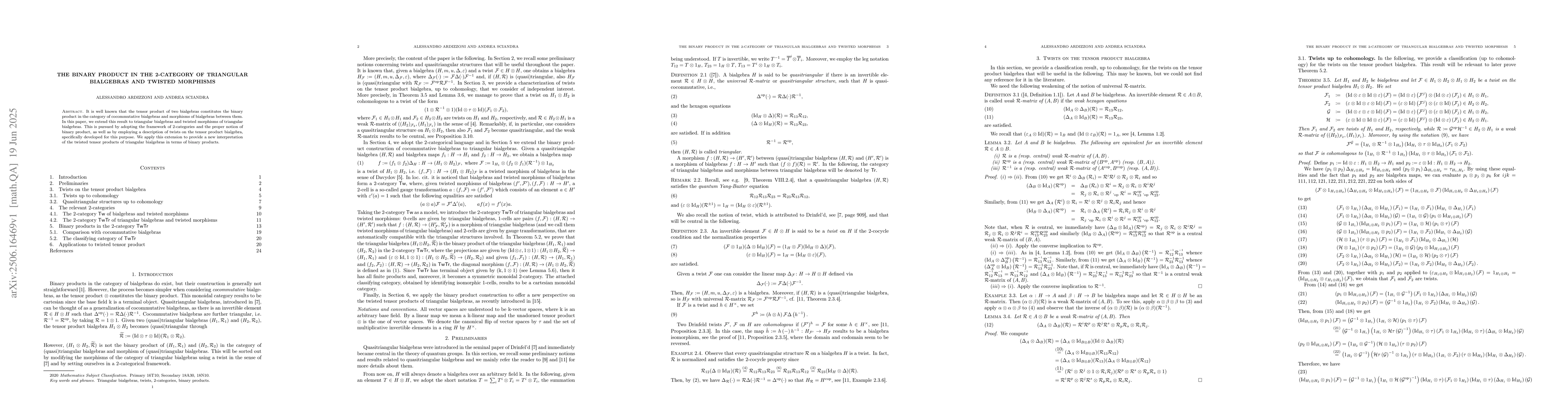 It is well known that the tensor product of two bialgebras constitutes the binary product in the category of cocommutative bialgebras and morphisms of bialgebras between them. In this paper, we extend this result to triangular bialgebras and twisted morphisms of triangular bialgebras. This is pursued by adopting the framework of 2-categories and the proper notion of binary product, as well as by employing a description of twists on the tensor product bialgebra, specifically developed for this purpose. We apply this extension to provide a new interpretation of the twisted tensor products of triangular bialgebras in terms of binary products.