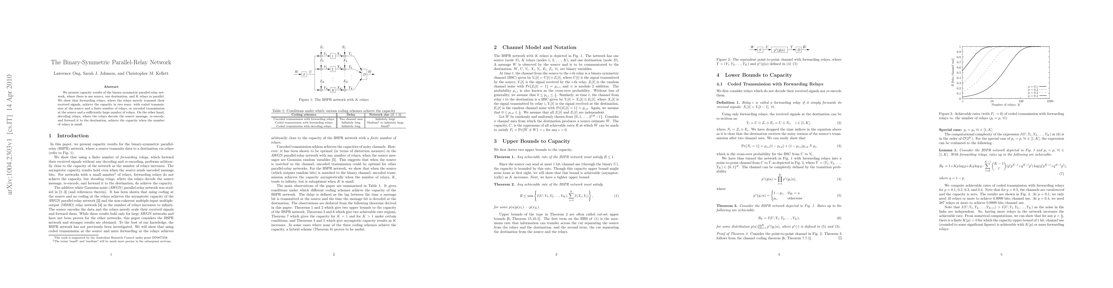 We present capacity results of the binary-symmetric parallel-relay network, where there is one source, one destination, and K relays in parallel. We show that forwarding relays, where the relays merely transmit their received signals, achieve the capacity in two ways: with coded transmission at the source and a finite number of relays, or uncoded transmission at the source and a sufficiently large number of relays. On the other hand, decoding relays, where the relays decode the source message, re-encode, and forward it to the destination, achieve the capacity when the number of relays is small.