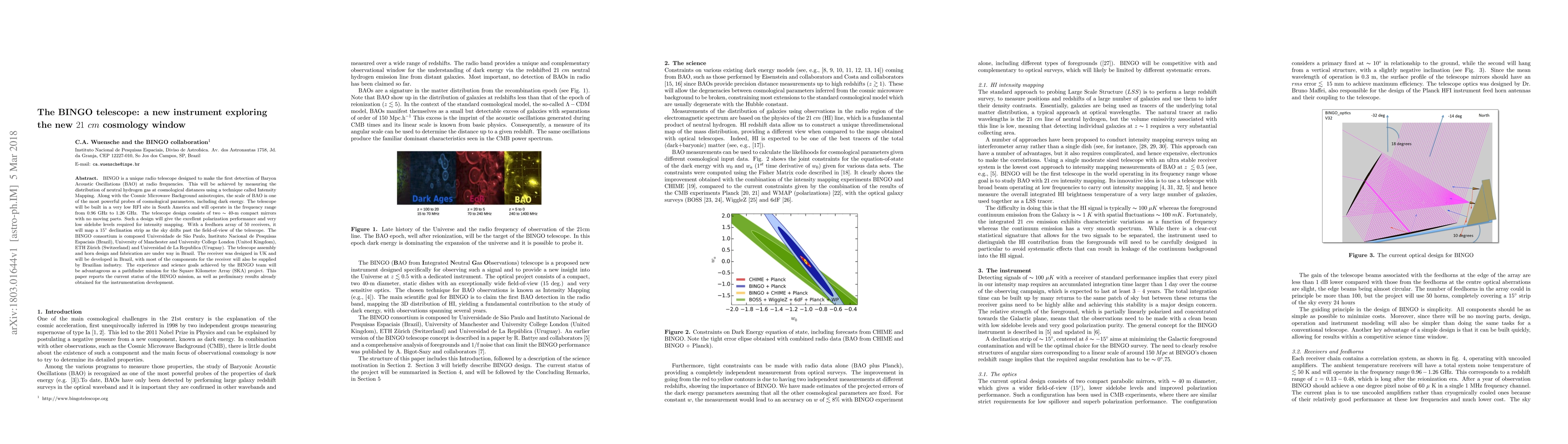 BINGO is a unique radio telescope designed to make the first detection of Baryon Acoustic Oscillations (BAO) at radio frequencies. This will be achieved by measuring the distribution of neutral hydrogen gas at cosmological distances using a technique called Intensity Mapping. Along with the Cosmic Microwave Background anisotropies, the scale of BAO is one of the most powerful probes of cosmological parameters, including dark energy. The telescope will be built in a very low RFI site in South America and will operate in the frequency range from 0.96 GHz to 1.26 GHz. The telescope design consists of two $\thicksim$ 40-m compact mirrors with no moving parts. Such a design will give the excellent polarization performance and very low sidelobe levels required for intensity mapping. With a feedhorn array of 50 receivers, it will map a $15^{\circ}$ declination strip as the sky drifts past the field-of-view of the telescope. The BINGO consortium is composed Universidade de S\~ao Paulo, Instituto Nacional de Pesquisas Espaciais (Brazil), University of Manchester and University College London (United Kingdom), ETH Z\"urich (Switzerland) and Universidad de La Republica (Uruguay). The telescope assembly and horn design and fabrication are under way in Brazil. The receiver was designed in UK and will be developed in Brazil, with most of the components for the receiver will also be supplied by Brazilian industry. The experience and science goals achieved by the BINGO team will be advantageous as a pathfinder mission for the Square Kilometre Array (SKA) project. This paper reports the current status of the BINGO mission, as well as preliminary results already obtained for the instrumentation development.