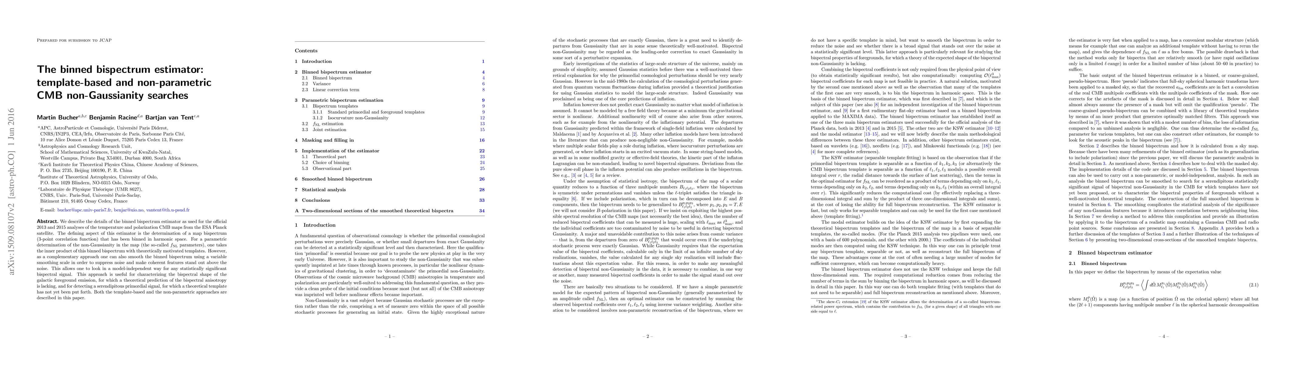 The paper describes the binned bispectrum estimator used for analyzing CMB temperature and polarization maps from the Planck satellite, detailing both template-based and non-parametric approaches for non-Gaussianity searches in the CMB.