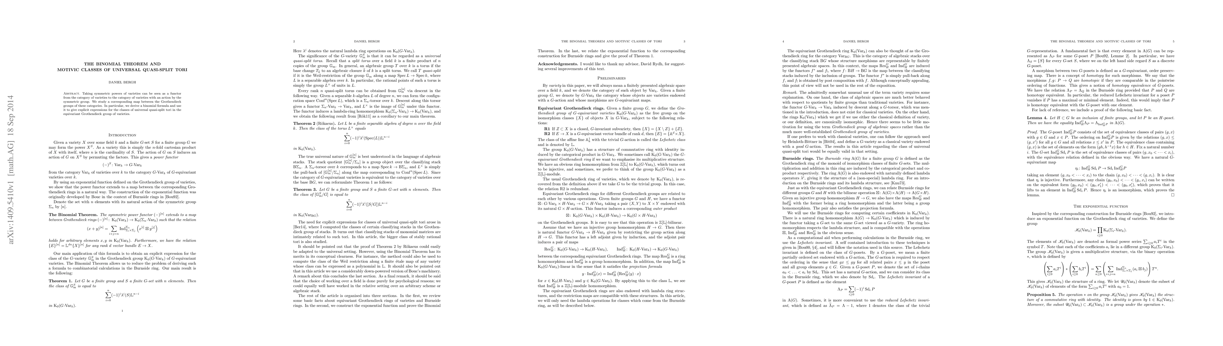 Researchers develop a binomial formula to calculate motivic classes of universal quasi-split tori in the equivariant Grothendieck group of varieties.
