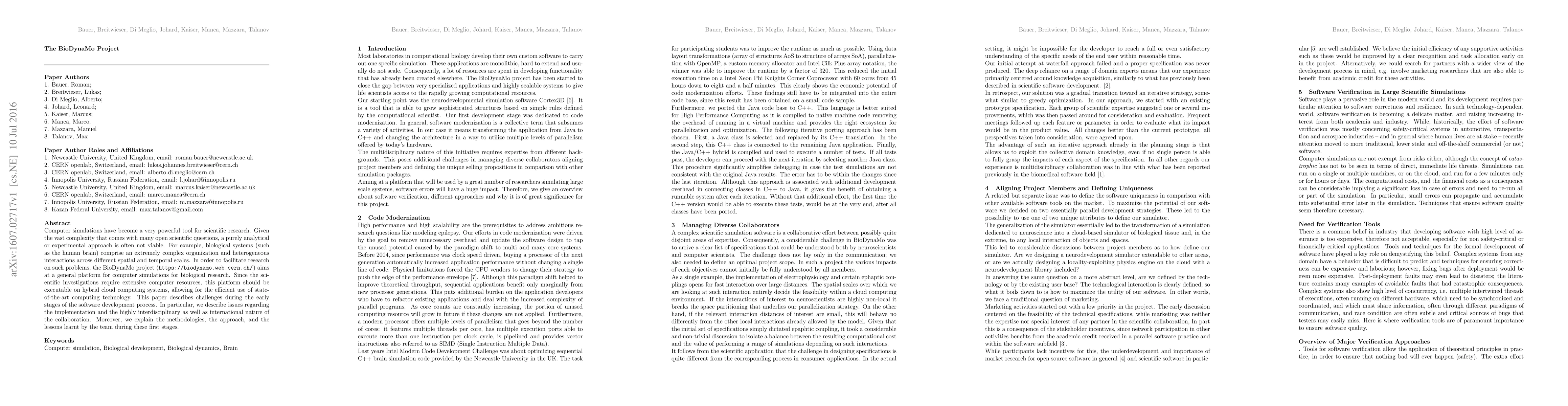 The BioDynaMo project presents a general platform for computer simulations in biological research, emphasizing code modernization, parallelization techniques, and an iterative approach to specification development.