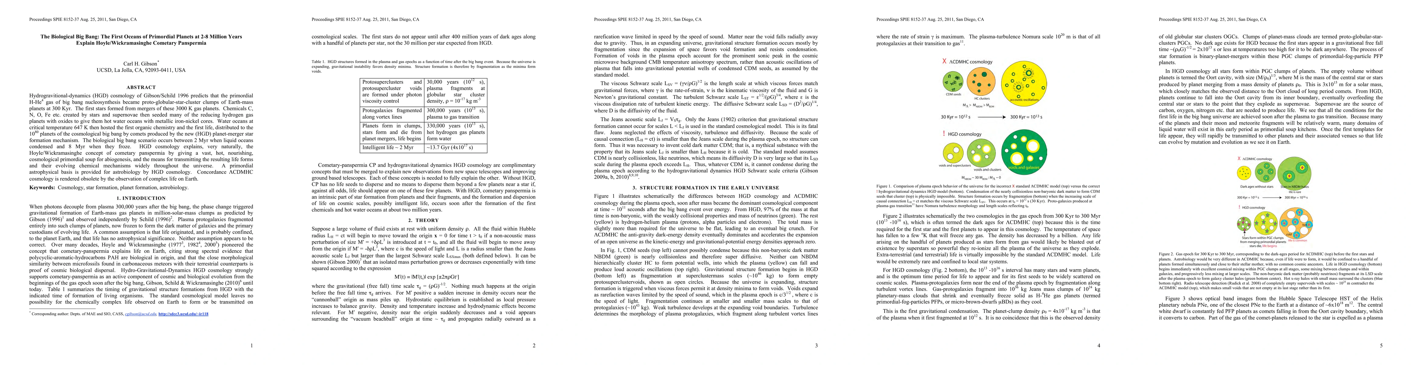 Hydrogravitional-dynamics (HGD) cosmology of Gibson/Schild 1996 predicts that the primordial H-He^4 gas of big bang nucleosynthesis became proto-globular-star-cluster clumps of Earth-mass planets at 300 Kyr. The first stars formed from mergers of these 3000 K gas planets. Chemicals C, N, O, Fe etc. created by stars and supernovae then seeded many of the reducing hydrogen gas planets with oxides to give them hot water oceans with metallic iron-nickel cores. Water oceans at critical temperature 647 K then hosted the first organic chemistry and the first life, distributed to the 10^80 planets of the cosmological big bang by comets produced by the new (HGD) planet-merger star formation mechanism. The biological big bang scenario occurs between 2 Myr when liquid oceans condensed and 8 Myr when they froze. HGD cosmology explains, very naturally, the Hoyle/Wickramasinghe concept of cometary panspermia by giving a vast, hot, nourishing, cosmological primordial soup for abiogenesis, and the means for transmitting the resulting life forms and their evolving chemical mechanisms widely throughout the universe. A primordial astrophysical basis is provided for astrobiology by HGD cosmology. Concordance {\Lambda}CDMHC cosmology is rendered obsolete by the observation of complex life on Earth.