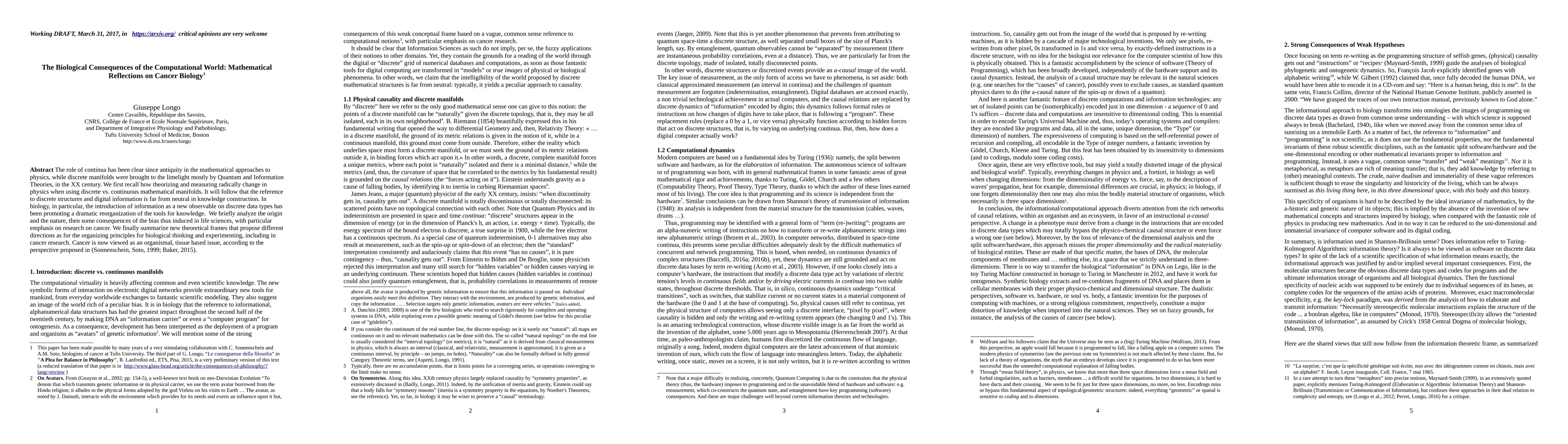 The role of continua has been clear since antiquity in the mathematical approaches to physics, while discrete manifolds were brought to the limelight mostly by Quantum and Information Theories, in the XX century. We first recall how theorizing and measuring radically change in physics when using discrete vs. continuous mathematical manifolds. It will follow that the reference to discrete structures and digital information is far from neutral in knowledge construction. In biology, in particular, the introduction of information as a new observable on discrete data types has been promoting a dramatic reorganization of the tools for knowledge. We briefly analyze the origin and the nature, then some consequences of the bias thus induced in life sciences, with particular emphasis on research on cancer. We finally summarize new theoretical frames that propose different directions as for the organizing principles for biological thinking and experimenting, including in cancer research. Cancer is now viewed as an organismal, tissue based issue, according to the perspective proposed in (Sonnenschein, Soto, 1999; Baker, 2015).