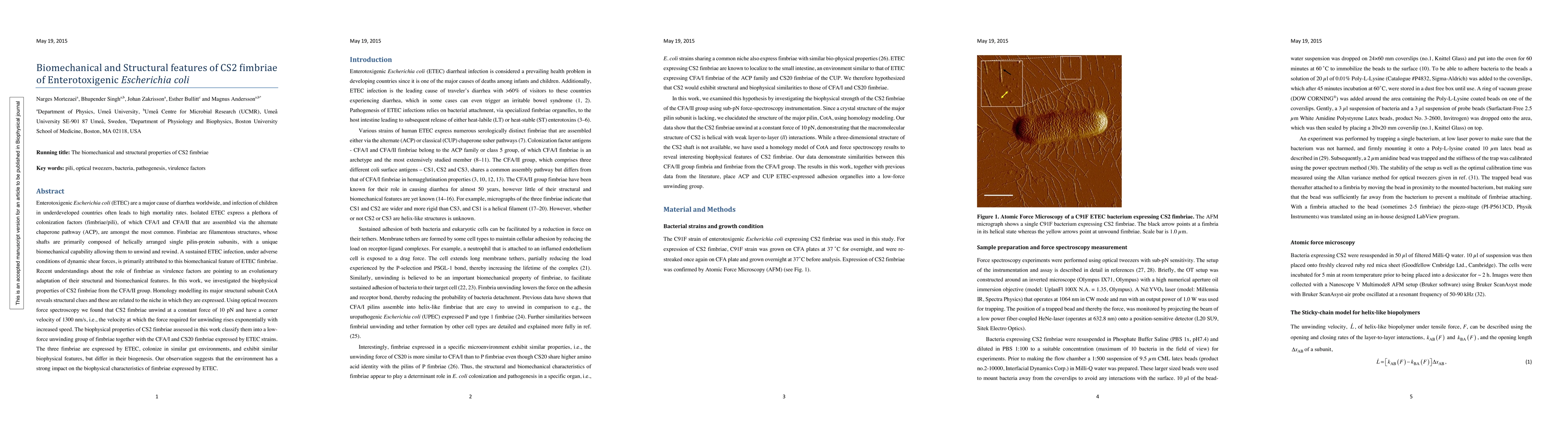 Research on CS2 fimbriae from ETEC reveals their ability to unwind at a constant force of 10 pN, with a corner velocity that rises exponentially with speed, suggesting an evolutionary adaptation to withstand dynamic shear forces in the gut.