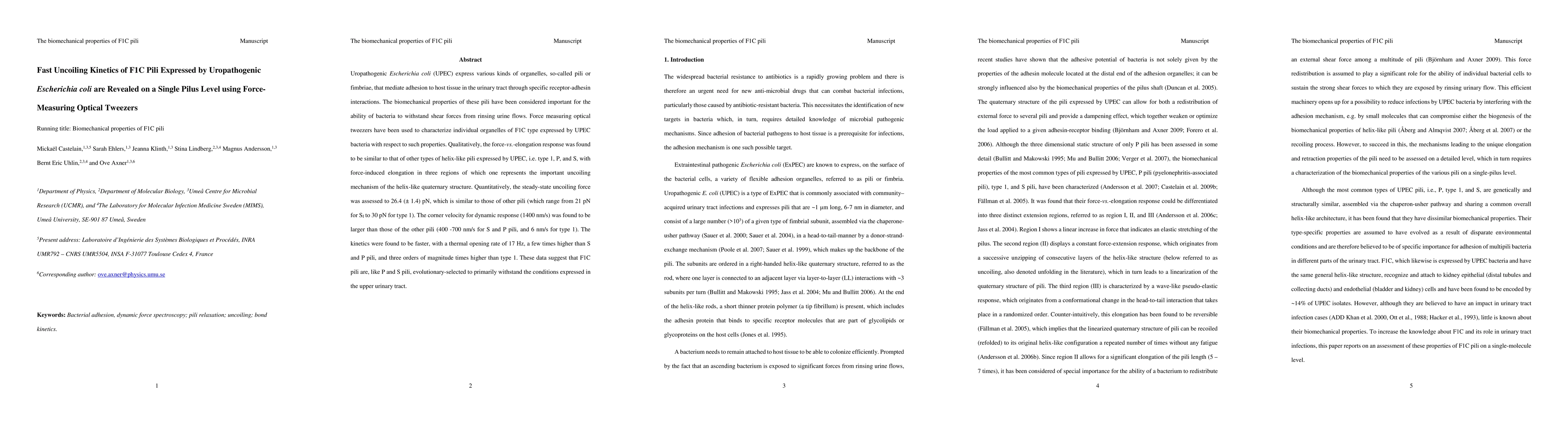 F1C pili from UPEC bacteria exhibit similar biomechanical properties to other types of helix-like pili, including high uncoiling forces and fast kinetics, suggesting they play a key role in withstanding urine flows in the upper urinary tract.