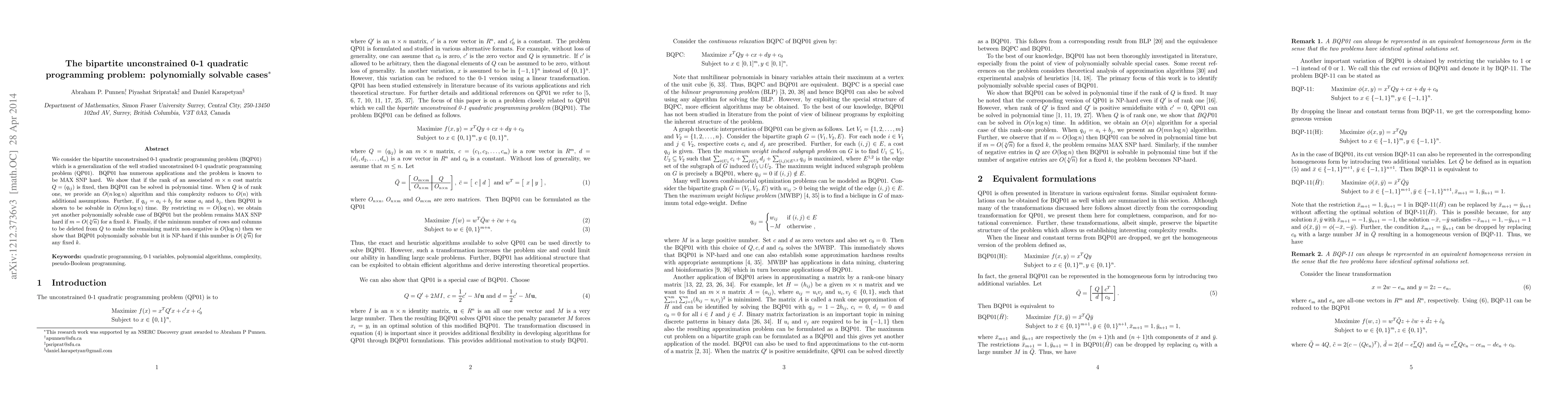 The paper analyzes the bipartite unconstrained 0-1 quadratic programming problem (BQP01) and identifies polynomially solvable cases based on the rank of the cost matrix Q.
