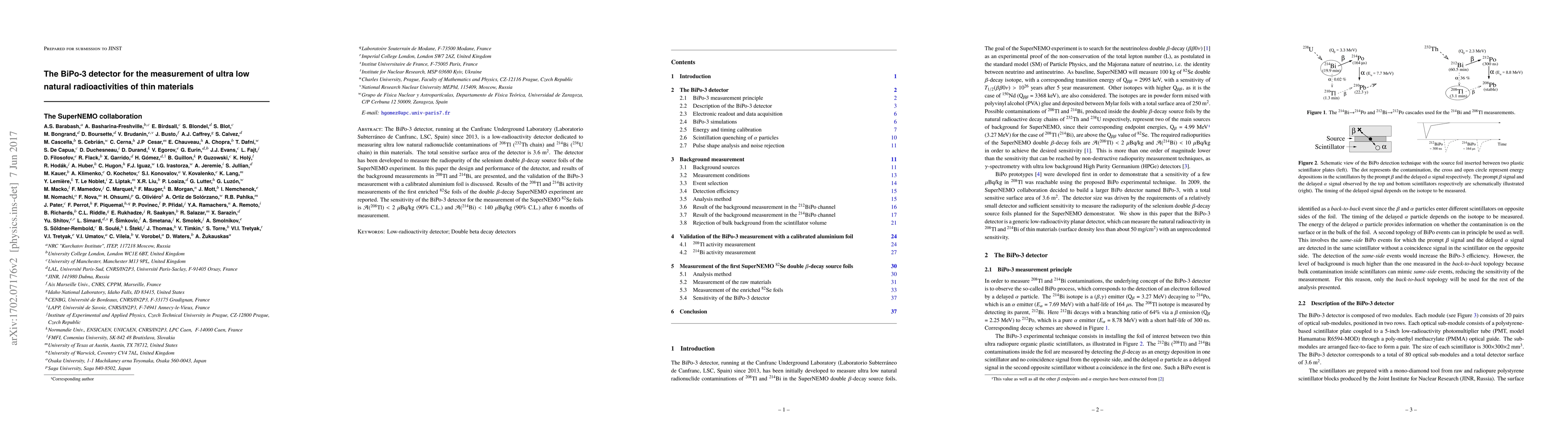 The BiPo-3 detector, deployed in the Canfranc Underground Laboratory since 2013, measures ultra low natural radioactivities of thin materials, specifically $^{208}$Tl and $^{214}$Bi. The detector has achieved sensitivities of $\mathcal{A}$($^{208}$Tl) $<2$ $\mu$Bq/kg and $\mathcal{A}$($^{214}$Bi) $<140$ $\mu$Bq/kg for the SuperNEMO experiment's selenium double $\beta$-decay source foils.