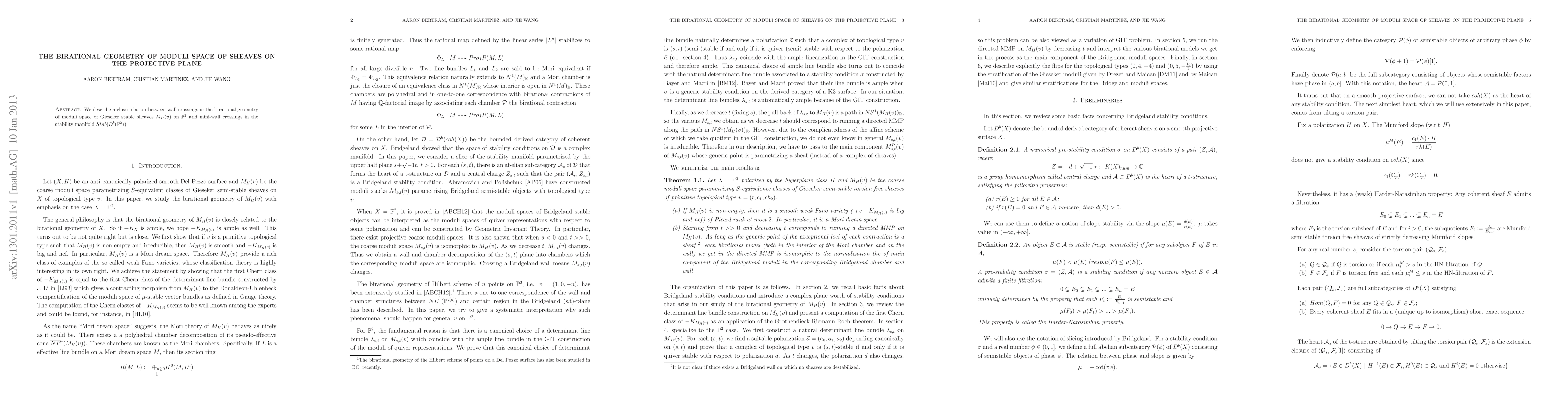 Summary: The paper investigates the connection between wall crossings in the birational geometry of Gieseker stable sheaves moduli space on $\bb{P}^2$ and mini-wall crossings in the stability manifold of the bounded derived category of $\bb{P}^2$. This relation elucidates deeper structural properties of the moduli space.