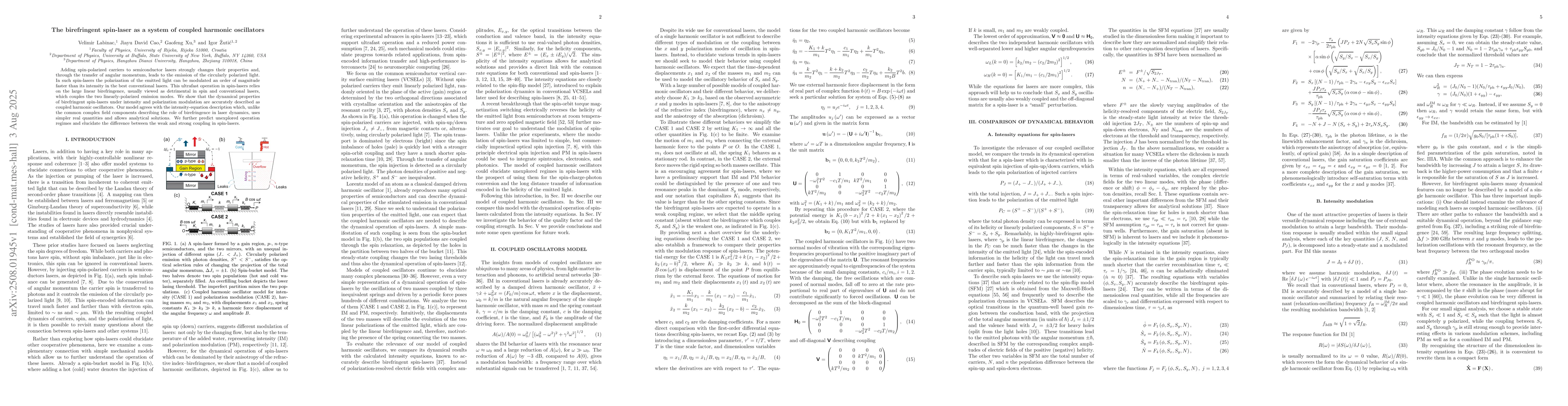 Adding spin-polarized carriers to semiconductor lasers strongly changes their properties and, through the transfer of angular momentum, leads to the emission of the circularly polarized light. In such spin-lasers the polarization of the emitted light can be modulated an order of magnitude faster than its intensity in the best conventional lasers. This ultrafast operation in spin-lasers relies on the large linear birefringence, usually viewed as detrimental in spin and conventional lasers, which couples the two linearly-polarized emission modes. We show that the dynamical properties of birefringent spin-lasers under intensity and polarization modulation are accurately described as coupled harmonic oscillators. Our model agrees with the intensity-equation description which, unlike the common complex field components describing the role of birefringence in laser dynamics, uses simpler real quantities and allows analytical solutions. We further predict unexplored operation regimes and elucidate the difference between the weak and strong coupling in spin-lasers.