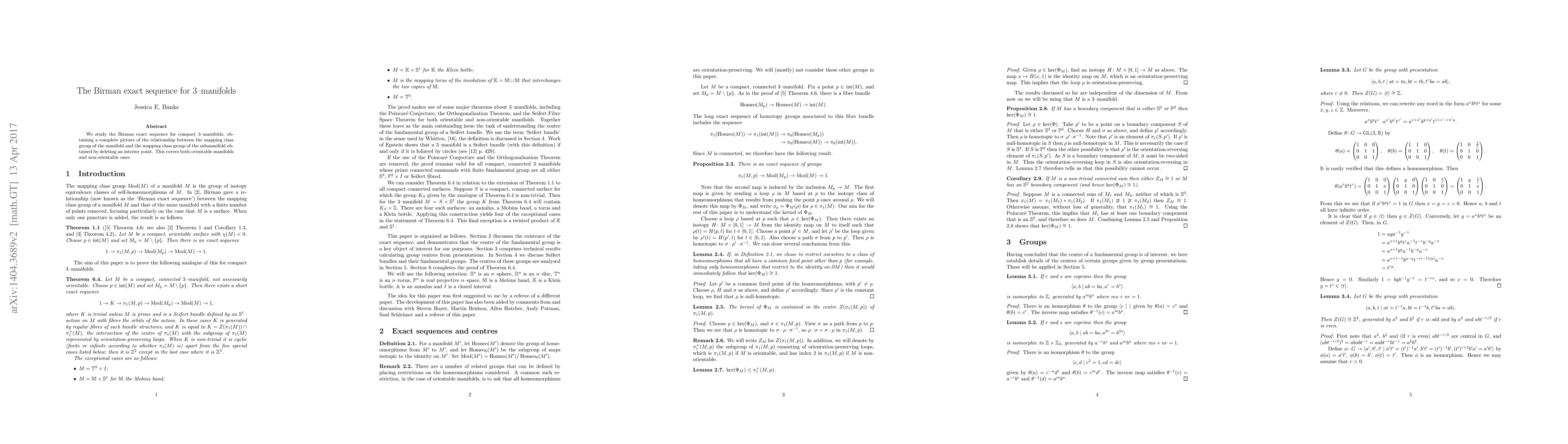 Summary: This paper explores the Birman exact sequence in the context of compact 3-manifolds, detailing the interplay between the mapping class groups of the manifold and the submanifold formed by removing an interior point, encompassing both orientable and non-orientable cases.
