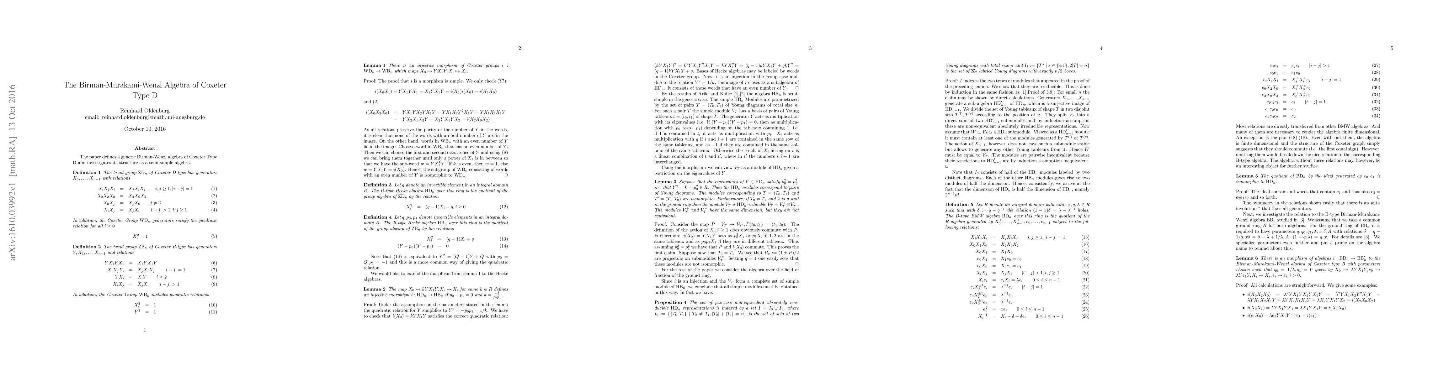 Summary: This paper introduces the Birman-Murakami-Wenzl algebra for Coxeter Type D and explores its properties, demonstrating that it forms a semi-simple algebra. The study provides insights into its structural characteristics.