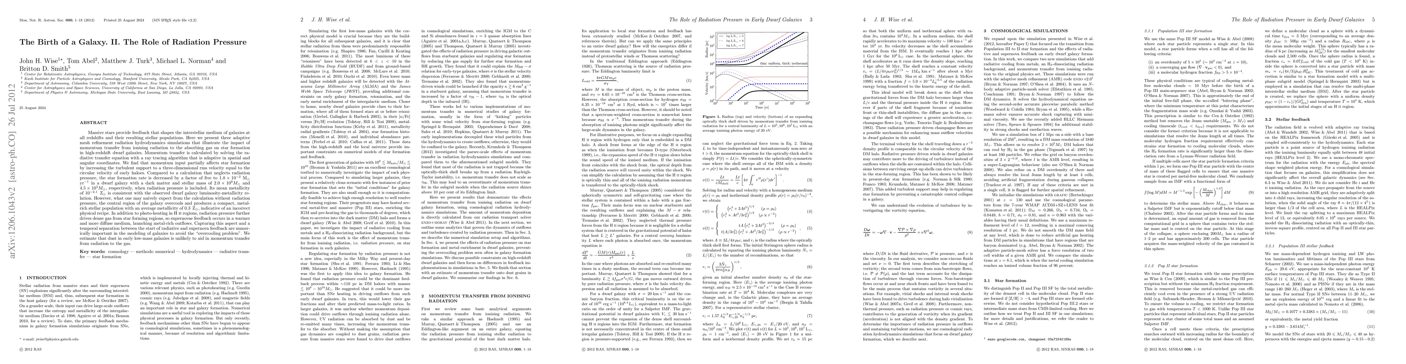 Massive stars provide feedback that shapes the interstellar medium of galaxies at all redshifts and their resulting stellar populations. Here we present three adaptive mesh refinement radiation hydrodynamics simulations that illustrate the impact of momentum transfer from ionising radiation to the absorbing gas on star formation in high-redshift dwarf galaxies. Momentum transfer is calculated by solving the radiative transfer equation with a ray tracing algorithm that is adaptive in spatial and angular coordinates. We find that momentum input partially affects star formation by increasing the turbulent support to a three-dimensional rms velocity equal to the circular velocity of early haloes. Compared to a calculation that neglects radiation pressure, the star formation rate is decreased by a factor of five to 1.8 x 10^{-2} Msun/yr in a dwarf galaxy with a dark matter and stellar mass of 2.0 x 10^8 and 4.5 x 10^5 solar masses, respectively, when radiation pressure is included. Its mean metallicity of 10^{-2.1} Z_sun is consistent with the observed dwarf galaxy luminosity-metallicity relation. However, what one may naively expect from the calculation without radiation pressure, the central region of the galaxy overcools and produces a compact, metal-rich stellar population with an average metallicity of 0.3 Z_sun, indicative of an incorrect physical recipe. In addition to photo-heating in HII regions, radiation pressure further drives dense gas from star forming regions, so supernovae feedback occurs in a warmer and more diffuse medium, launching metal-rich outflows. Capturing this aspect and a temporal separation between the start of radiative and supernova feedback are numerically important in the modeling of galaxies to avoid the "overcooling problem". We estimate that dust in early low-mass galaxies is unlikely to aid in momentum transfer from radiation to the gas.
