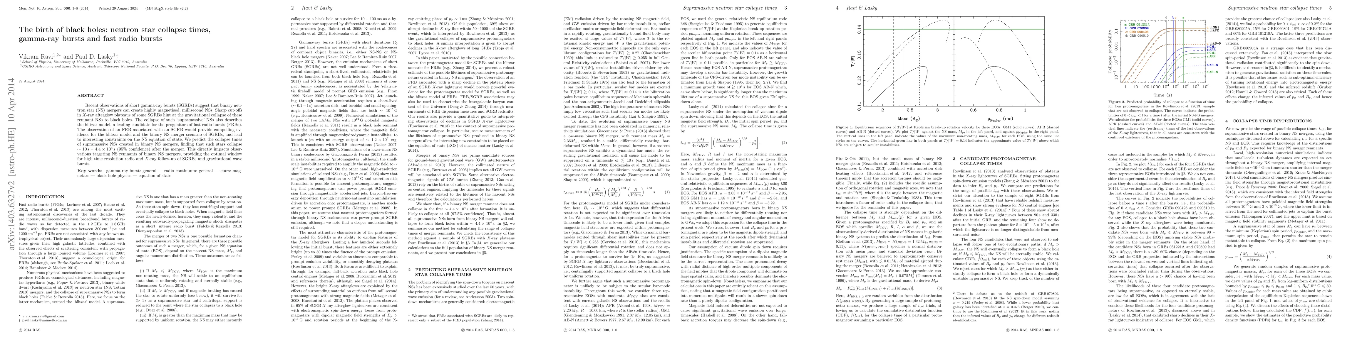 This paper investigates the collapse times of supramassive neutron stars formed from binary neutron star mergers, predicting they collapse within 10 to 44,000 seconds post-merger. Such collapses could generate black holes, gamma-ray bursts, and fast radio bursts, offering insights into the neutron star equation of state and the blitzar model.
