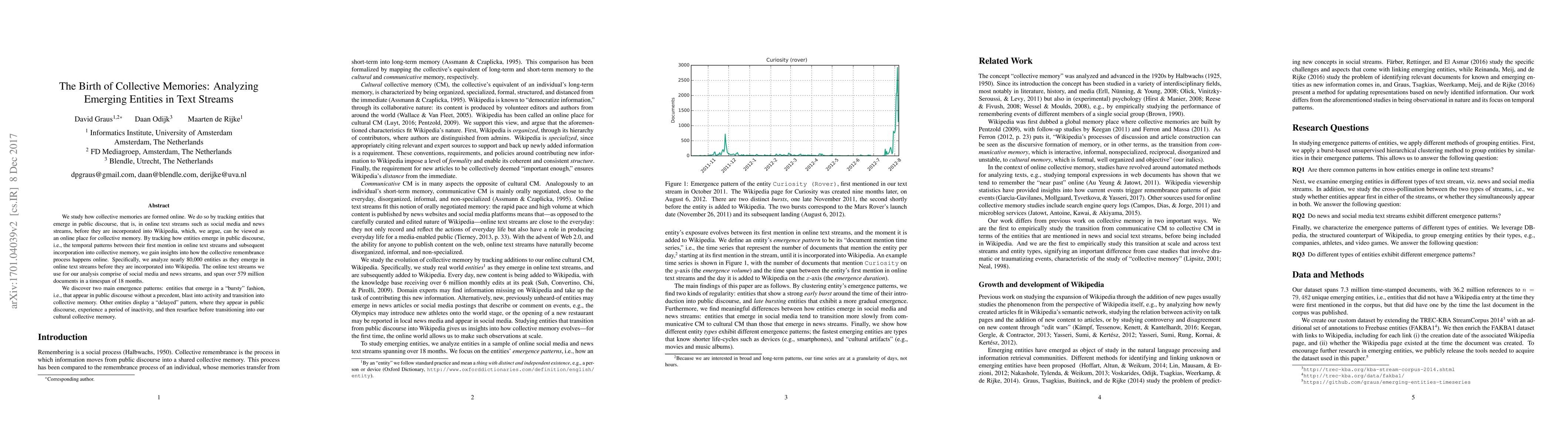 This paper investigates the formation of collective memories online by analyzing the emergence patterns of entities in public discourse, particularly in social media and news streams, before they are incorporated into Wikipedia. It reveals two main patterns: "bursty" emergence and "delayed" emergence, providing insights into the collective remembrance process.