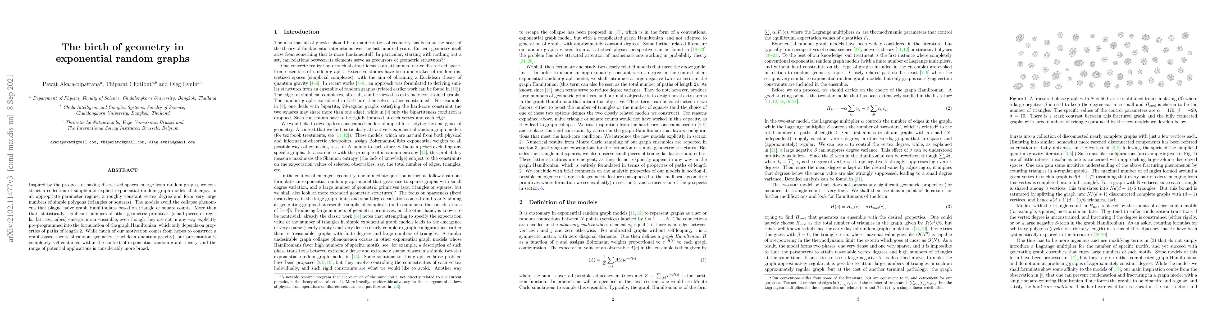 Inspired by the prospect of having discretized spaces emerge from random graphs, we construct a collection of simple and explicit exponential random graph models that enjoy, in an appropriate parameter regime, a roughly constant vertex degree and form very large numbers of simple polygons (triangles or squares). The models avoid the collapse phenomena that plague naive graph Hamiltonians based on triangle or square counts. More than that, statistically significant numbers of other geometric primitives (small pieces of regular lattices, cubes) emerge in our ensemble, even though they are not in any way explicitly pre-programmed into the formulation of the graph Hamiltonian, which only depends on properties of paths of length 2. While much of our motivation comes from hopes to construct a graph-based theory of random geometry (Euclidean quantum gravity), our presentation is completely self-contained within the context of exponential random graph theory, and the range of potential applications is considerably more broad.
