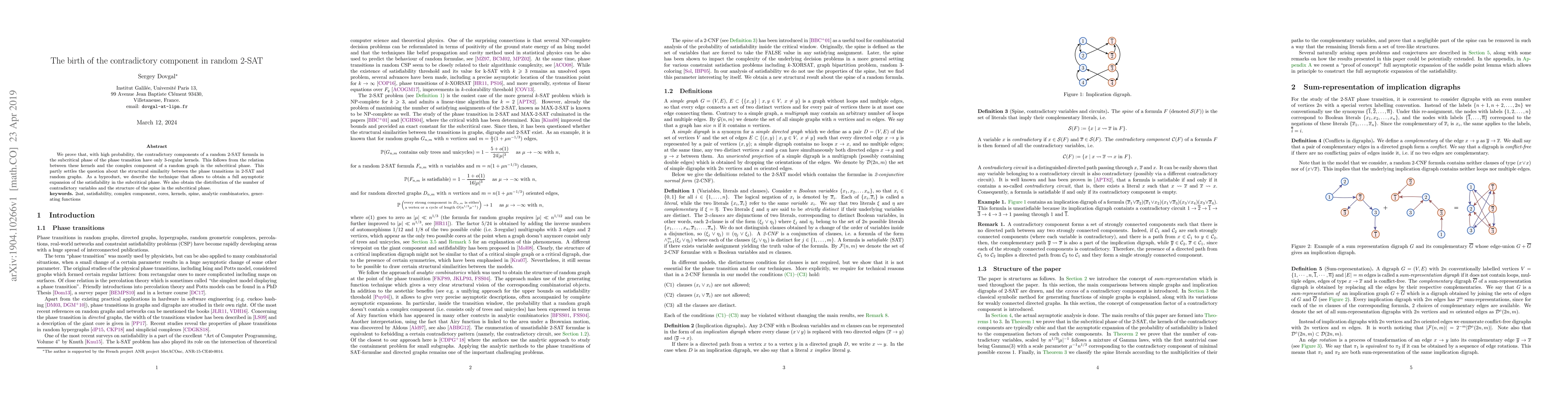This research proves that random 2-SAT formulas in the subcritical phase have contradictory components with 3-regular kernels, linking this to random graph theory. It also provides an asymptotic expansion for satisfiability, the distribution of contradictory variables, and the structure of the spine in the subcritical phase.