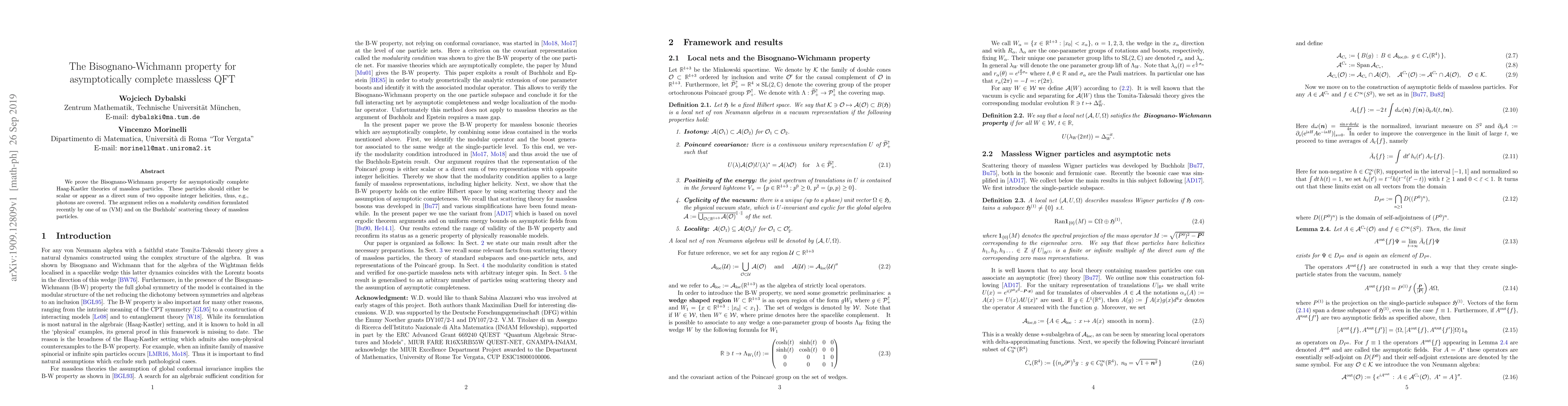 This paper proves the Bisognano-Wichmann property for asymptotically complete massless QFTs, focusing on scalar or dual-helicity particles like photons, using a modularity condition and Buchholz's scattering theory.