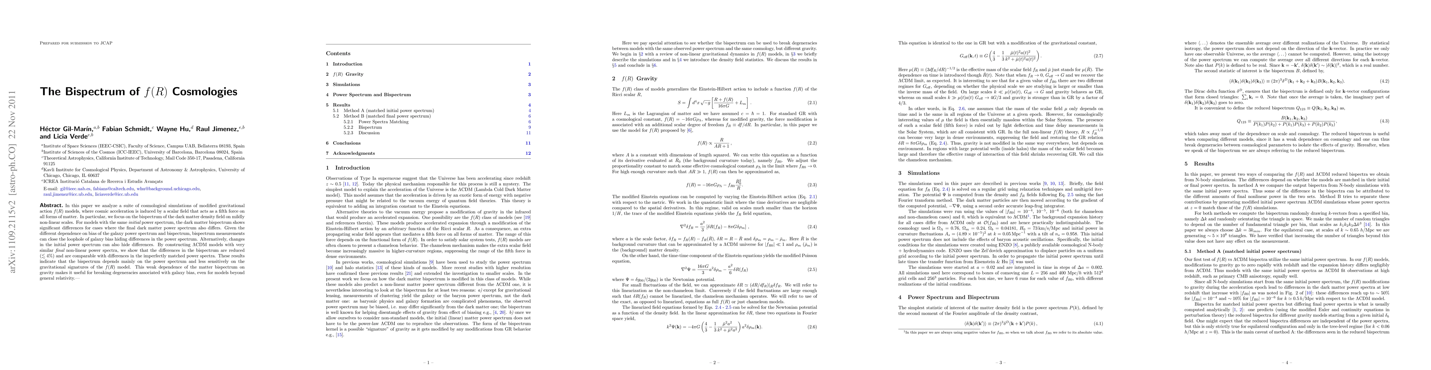 In this paper we analyze a suite of cosmological simulations of modified gravitational action f(R) models, where cosmic acceleration is induced by a scalar field that acts as a fifth force on all forms of matter. In particular, we focus on the bispectrum of the dark matter density field on mildly non-linear scales. For models with the same initial power spectrum, the dark matter bispectrum shows significant differences for cases where the final dark matter power spectrum also differs. Given the different dependence on bias of the galaxy power spectrum and bispectrum, bispectrum measurements can close the loophole of galaxy bias hiding differences in the power spectrum. Alternatively, changes in the initial power spectrum can also hide differences. By constructing LCDM models with very similar final non-linear power spectra, we show that the differences in the bispectrum are reduced (<4%) and are comparable with differences in the imperfectly matched power spectra. These results indicate that the bispectrum depends mainly on the power spectrum and less sensitively on the gravitational signatures of the f(R) model. This weak dependence of the matter bispectrum on gravity makes it useful for breaking degeneracies associated with galaxy bias, even for models beyond general relativity.