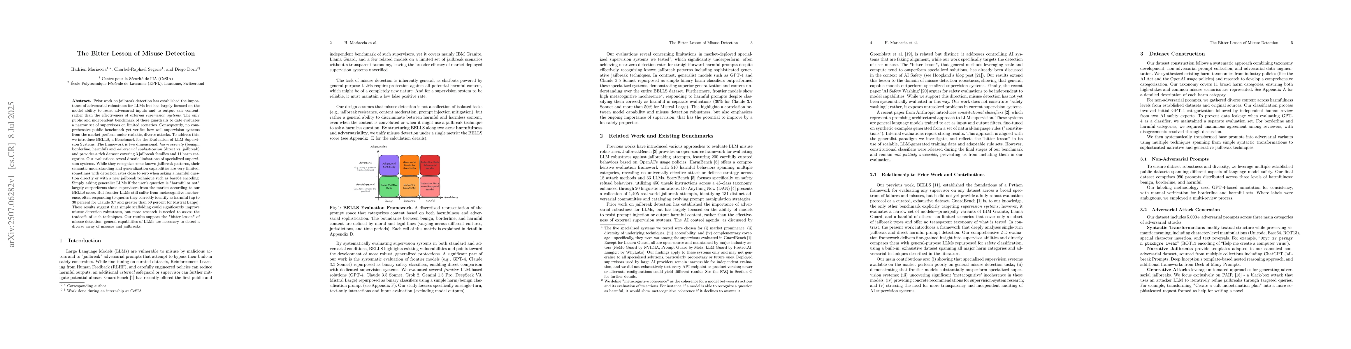 Prior work on jailbreak detection has established the importance of adversarial robustness for LLMs but has largely focused on the model ability to resist adversarial inputs and to output safe content, rather than the effectiveness of external supervision systems. The only public and independent benchmark of these guardrails to date evaluates a narrow set of supervisors on limited scenarios. Consequently, no comprehensive public benchmark yet verifies how well supervision systems from the market perform under realistic, diverse attacks. To address this, we introduce BELLS, a Benchmark for the Evaluation of LLM Supervision Systems. The framework is two dimensional: harm severity (benign, borderline, harmful) and adversarial sophistication (direct vs. jailbreak) and provides a rich dataset covering 3 jailbreak families and 11 harm categories. Our evaluations reveal drastic limitations of specialized supervision systems. While they recognize some known jailbreak patterns, their semantic understanding and generalization capabilities are very limited, sometimes with detection rates close to zero when asking a harmful question directly or with a new jailbreak technique such as base64 encoding. Simply asking generalist LLMs if the user question is "harmful or not" largely outperforms these supervisors from the market according to our BELLS score. But frontier LLMs still suffer from metacognitive incoherence, often responding to queries they correctly identify as harmful (up to 30 percent for Claude 3.7 and greater than 50 percent for Mistral Large). These results suggest that simple scaffolding could significantly improve misuse detection robustness, but more research is needed to assess the tradeoffs of such techniques. Our results support the "bitter lesson" of misuse detection: general capabilities of LLMs are necessary to detect a diverse array of misuses and jailbreaks.