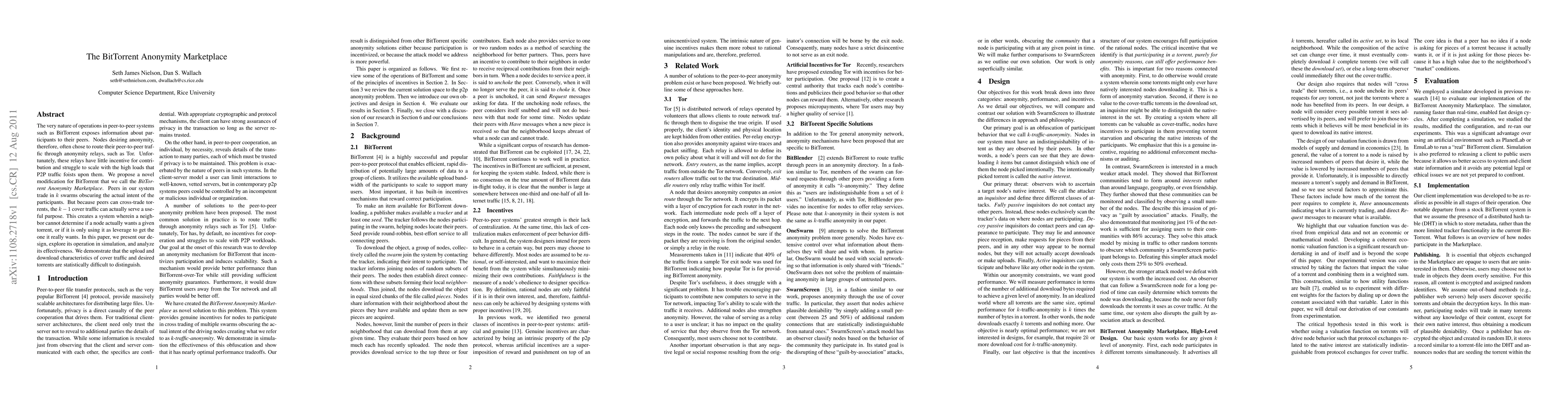 The BitTorrent Anonymity Marketplace proposes a novel peer-to-peer traffic modification where peers trade in swarms to obscure true intent, creating a scalable anonymity solution that leverages cover traffic for useful purposes. Simulation results show that cover traffic and desired torrents are statistically indistinguishable, enhancing anonymity.