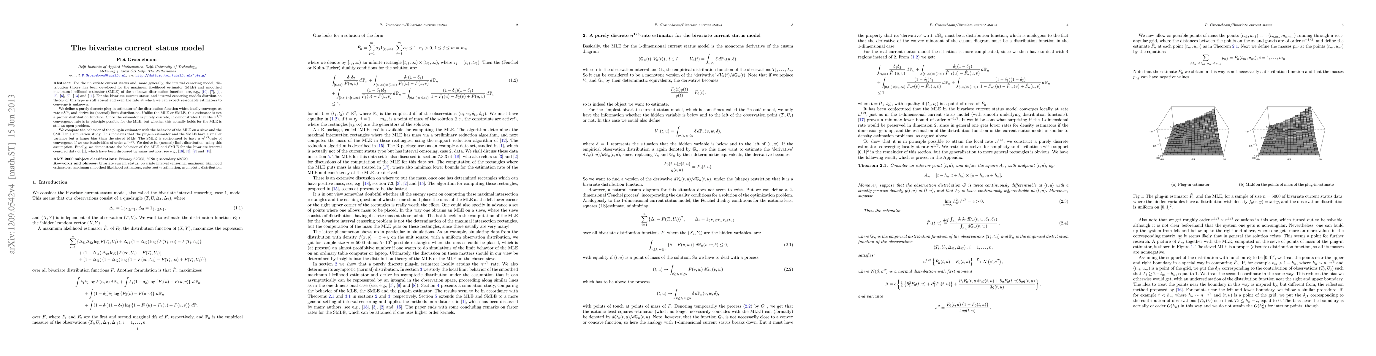 For the univariate current status and, more generally, the interval censoring model, distribution theory has been developed for the maximum likelihood estimator (MLE) and smoothed maximum likelihood estimator (SMLE) of the unknown distribution function, see, e.g., [12], [7], [4], [5], [6], [10], [11] and [8]. For the bivariate current status and interval censoring models distribution theory of this type is still absent and even the rate at which we can expect reasonable estimators to converge is unknown. We define a purely discrete plug-in estimator of the distribution function which locally converges at rate n^{1/3} and derive its (normal) limit distribution. Unlike the MLE or SMLE, this estimator is not a proper distribution function. Since the estimator is purely discrete, it demonstrates that the n^{1/3} convergence rate is in principle possible for the MLE, but whether this actually holds for the MLE is still an open problem. If the cube root n rate holds for the MLE, this would mean that the local 1-dimensional rate of the MLE continues to hold in dimension 2, a (perhaps) somewhat surprising result. The simulation results do not seem to be in contradiction with this assumption, however. We compare the behavior of the plug-in estimator with the behavior of the MLE on a sieve and the SMLE in a simulation study. This indicates that the plug-in estimator and the SMLE have a smaller variance but a larger bias than the sieved MLE. The SMLE is conjectured to have a n^{1/3}-rate of convergence if we use bandwidths of order n^{-1/6}. We derive its (normal) limit distribution, using this assumption. Finally, we demonstrate the behavior of the MLE and SMLE for the bivariate interval censored data of [1], which have been discussed by many authors, see e.g., [18], [3], [2] and [15].