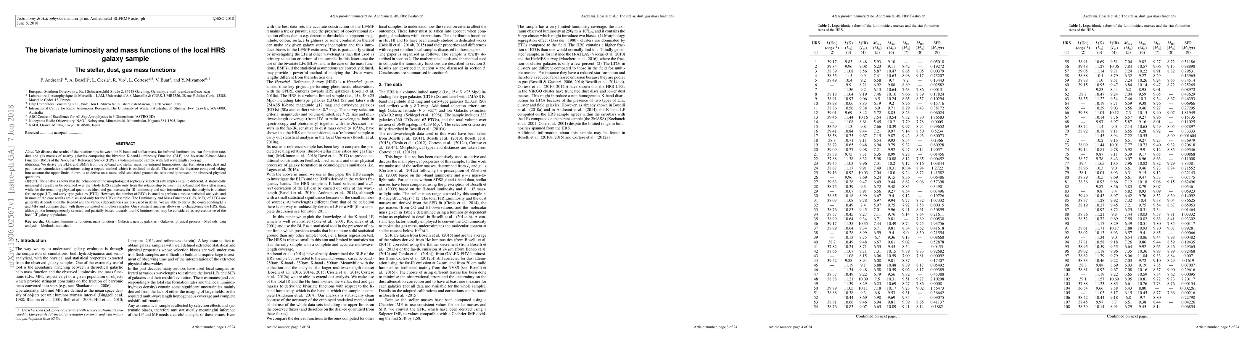 We discuss the results of the relationships between the K-band and stellar mass, far-infrared luminosities, star formation rate, dust and gas masses of nearby galaxies computing the bivariate K-band Luminosity Function (BLF) and bivariate K-band Mass Function (BMF) of the Herschel Reference Survey (HRS), a volume-limited sample with full wavelength coverage. We derive the BLFs and BMFs from the K-band and stellar mass, far-infrared luminosities, star formation rate, dust and gas masses cumulative distributions using a copula method which is outlined in detail. The use of the bivariate computed taking into account the upper limits allows us to derive on a more solid statistical ground the relationship between the observed physical quantities. The analysis shows that the behaviour of the morphological (optically selected) subsamples is quite different. A statistically meaningful result can be obtained over the whole HRS sample only from the relationship between the K-band and the stellar mass, while for the remaining physical quantities (dust and gas masses, far-IR luminosity and star formation rate), the analysis is distinct for late-type (LT) and early-type galaxies (ETG). However, the number of ETGs is small to perform a robust statistical analysis, and in most of the case results are discussed only for the LTG subsample. The Luminosity and Mass Functions (LFs, MFs) of LTGs are generally dependent on the K-band and the various dependencies are discussed in detail. We are able to derive the corresponding LFs and MFs and compare them with those computed with other samples. Our statistical analysis allows us to characterise the HRS, that, although non homogeneously selected and partially biased towards low IR luminosities, may be considered as representative of the local LT galaxy population.