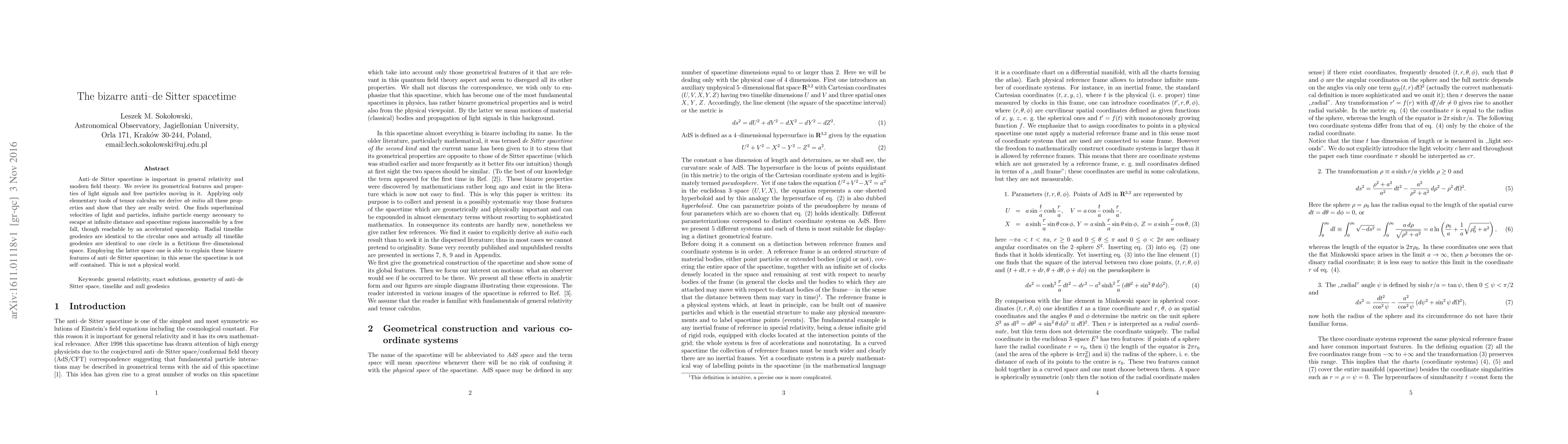 This paper explores the peculiar geometrical features of anti-de Sitter spacetime, revealing superluminal light and particle velocities, infinite escape energy, and inaccessible regions, all explained through a fictitious five-dimensional space. The study highlights the spacetime's non-self-contained nature and its non-physical characteristics.