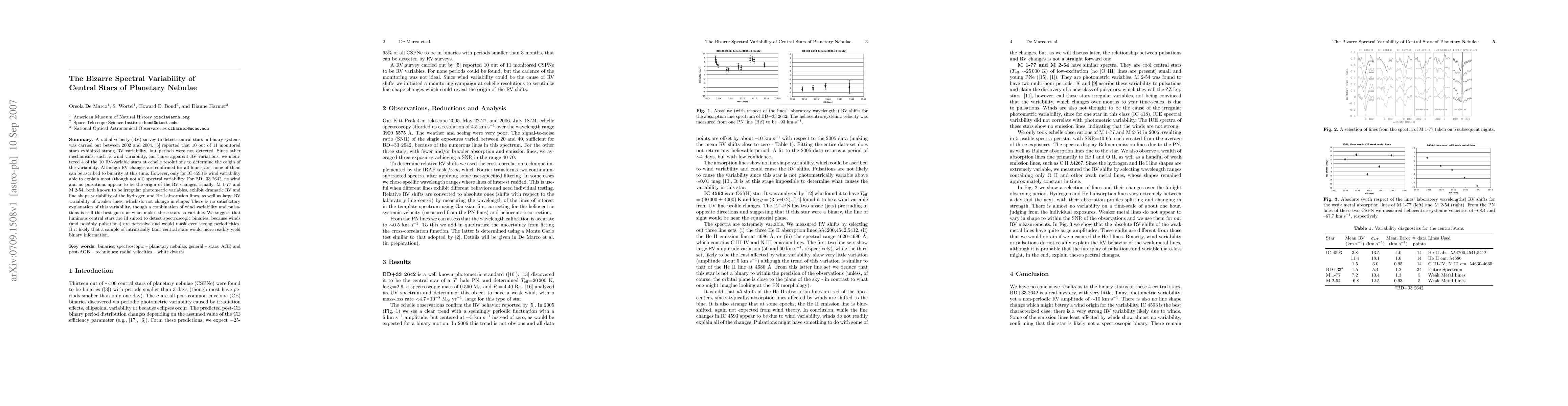 A radial velocity (RV) survey to detect central stars in binary systems was carried out between 2002 and 2004. De Marco et al. (2004) reported that 10 out of 11 monitored stars exhibited strong RV variability, but periods were not detected. Since other mechanisms, such as wind variability, can cause apparent RV variations, we monitored 4 of the 10 RV-variable stars at echelle resolutions to determine the origin of the variability. Although RV changes are confirmed for all four stars, none of them can be ascribed to binarity at this time. However, only for IC4593 is wind variability able to explain most (though not all) spectral variability. For BD+332642, no wind and no pulsations appear to be the origin of the RV changes. Finally, M1-77 and M2-54, both known to be irregular photometric variables, exhibit dramatic RV and line shape variability of the hydrogen and HeI absorption lines, as well as large RV variability of weaker lines, which do not change in shape. There is no satisfactory explanation of this variability, though a combination of wind variability and pulsations is still the best guess at what makes these stars so variable. We suggest that luminous central stars are ill suited to detect spectroscopic binaries, because winds (and possibly pulsations) are pervasive and would mask even strong periodicities. It it likely that a sample of intrinsically faint central stars would more readily yield binary information.
