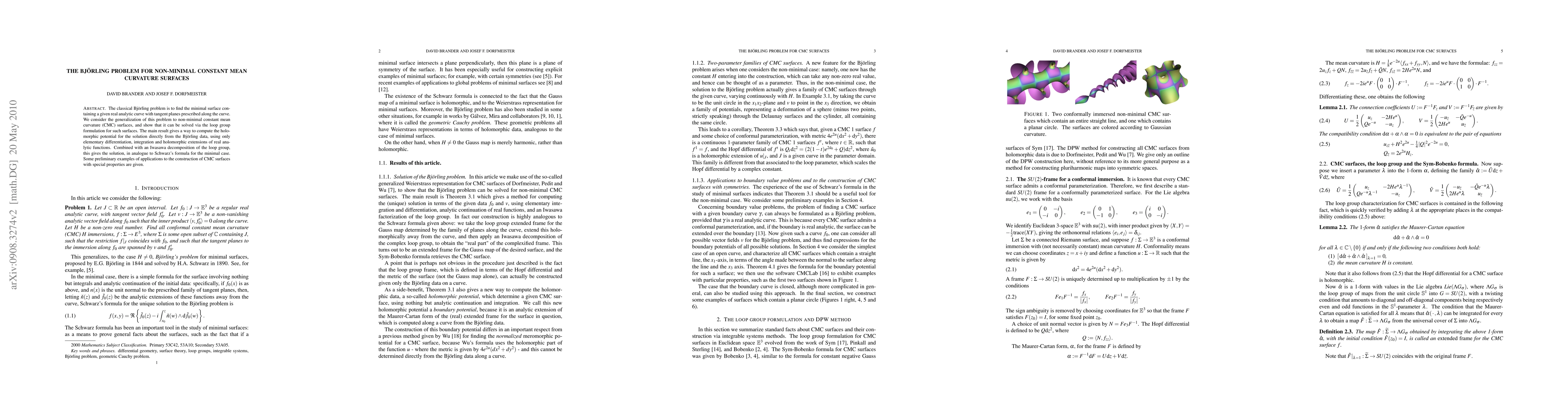 The research utilizes the loop group formulation to solve the generalized Björling problem for non-minimal constant mean curvature (CMC) surfaces, providing a method to compute the holomorphic potential directly from Björling data through differentiation, integration, and holomorphic extensions.