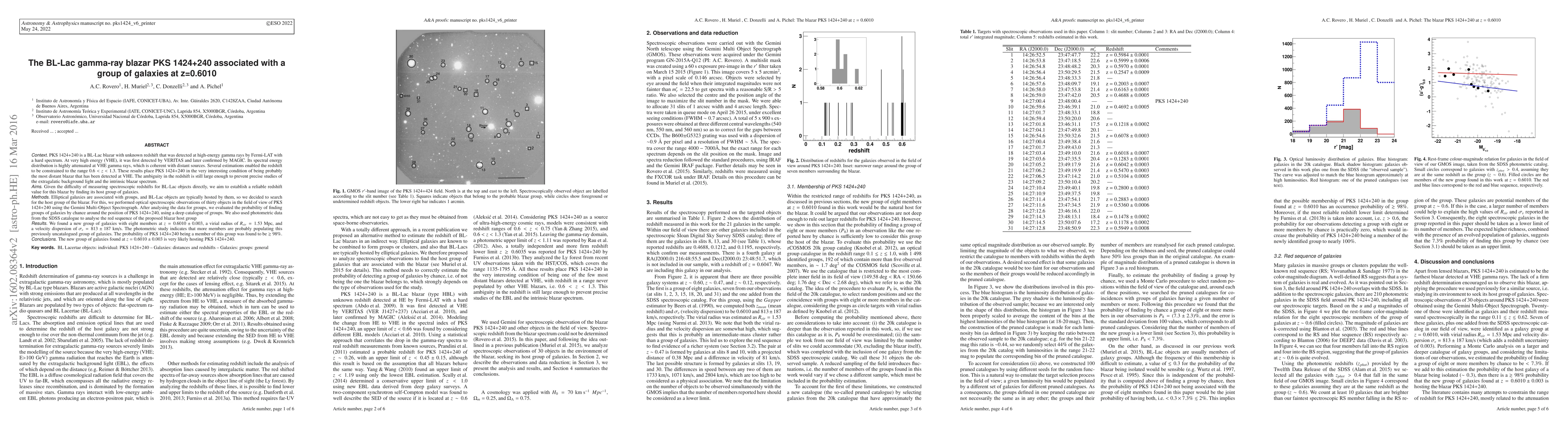 PKS 1424+240 is a BL-Lac blazar with unknown redshift that was detected at high-energy gamma rays by Fermi-LAT with a hard spectrum. At VHE, it was first detected by VERITAS and later confirmed by MAGIC. Its spectral energy distribution is highly attenuated at VHE gamma rays, which is coherent with distant sources. Several estimations enabled the redshift to be constrained to the range 0.6 < z < 1.3. These results place PKS 1424+240 in the very interesting condition of being probably the most distant blazar that has been detected at VHE. The ambiguity in the redshift is still large enough to prevent precise studies of the EBL and the intrinsic blazar spectrum. Given the difficulty of measuring spectroscopic redshifts for BL-Lac objects directly, we aim to establish a reliable redshift value for this blazar by finding its host group of galaxies. Elliptical galaxies are associated with groups, and BL-Lac objects are typically hosted by them, so we decided to search for the host group of the blazar. For this, we performed optical spectroscopic observations of thirty objects in the field of view of PKS 1424+240 using the Gemini MOS. After analysing the data for groups, we evaluated the probability of finding groups of galaxies by chance around the position of PKS 1424+240, using a deep catalogue of groups. We also used photometric data from the SDSS catalogue to analyse the red sequence of the proposed blazar host group. We found a new group of galaxies with eight members at z = 0.6010 +- 0.003, a virial radius of R_vir = 1.53 Mpc, and a velocity dispersion of sigma_v = 813 +- 187 km/s. The photometric study indicates that more members are probably populating this previously uncatalogued group of galaxies. The probability of PKS 1424+240 being a member of this group was found to be 98%. The new group of galaxies found at z = 0.6010 +- 0.003 is very likely hosting PKS 1424+240.
