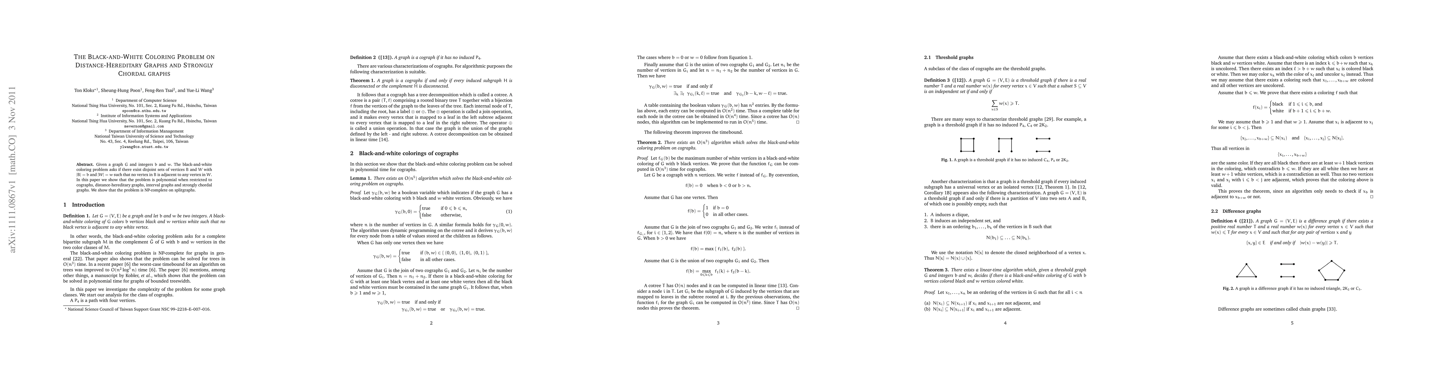 Researchers have solved the black-and-white coloring problem on specific types of graphs, including cographs, distance-hereditary graphs, interval graphs, and strongly chordal graphs, with a polynomial solution, while showing it's NP-complete on splitgraphs.