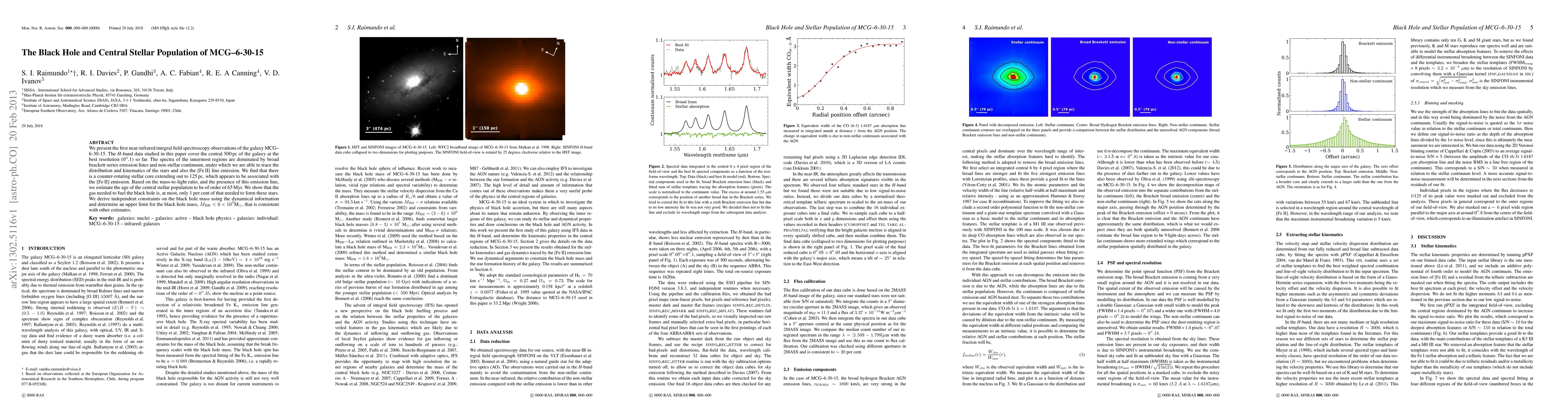 We present the first near-infrared integral field spectroscopy observations of the galaxy MCG--6-30-15. The H-band data studied in this paper cover the central 500 pc of the galaxy at the best resolution (0".1) so far. The spectra of the innermost regions are dominated by broad brackett series emission lines and non-stellar continuum, under which we are able to trace the distribution and kinematics of the stars and also the [Fe II] line emission. We find that there is a counter-rotating stellar core extending out to 125 pc, which appears to be associated with the [Fe II] emission. Based on the mass-to-light ratio, and the presence of this emission line, we estimate the age of the central stellar population to be of order of 65 Myr. We show that the gas needed to fuel the black hole is, at most, only 1 per cent of that needed to form these stars. We derive independent constraints on the black hole mass using the dynamical information and determine an upper limit for the black hole mass, Mbh < 6e7 Msun, that is consistent with other estimates.